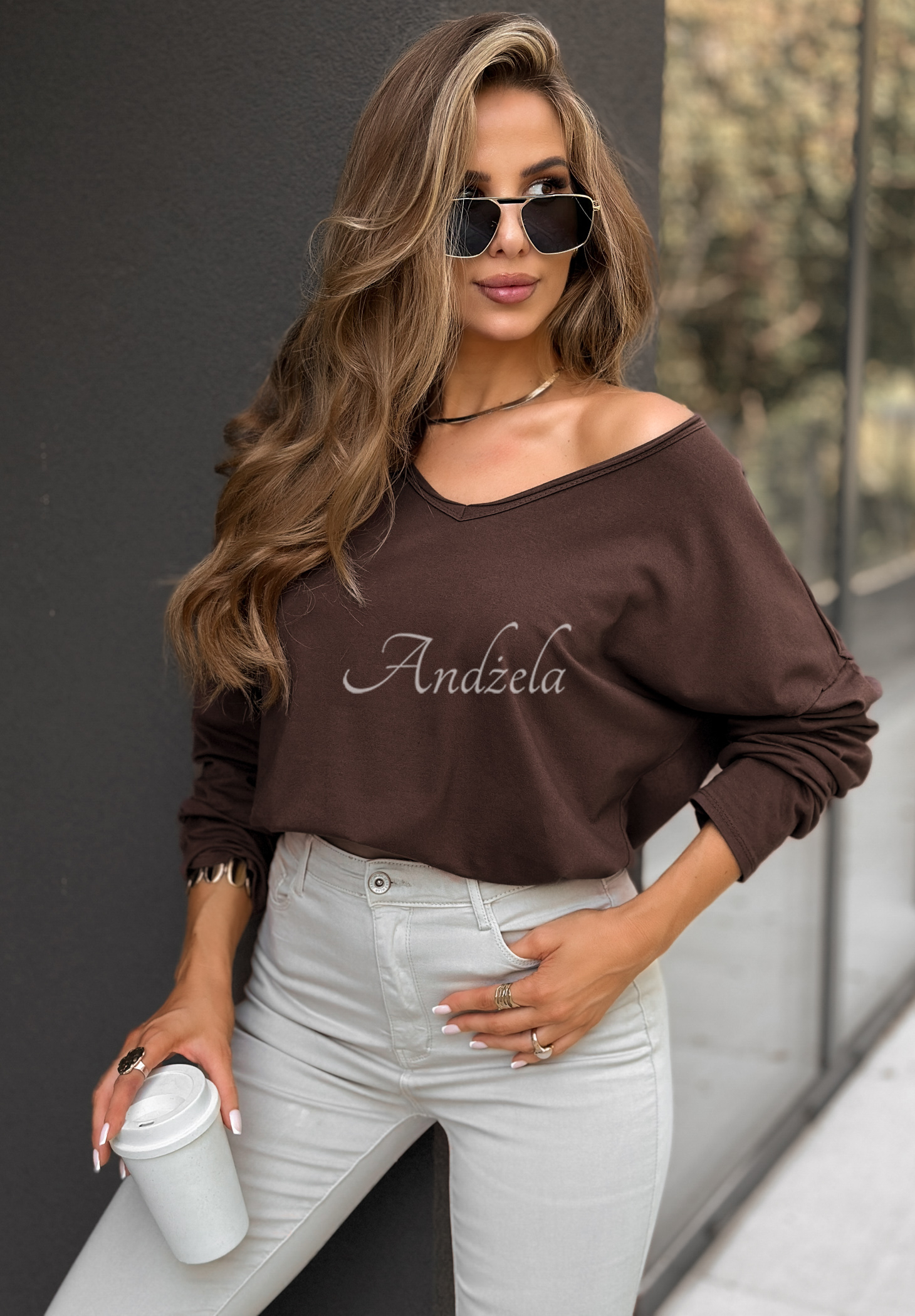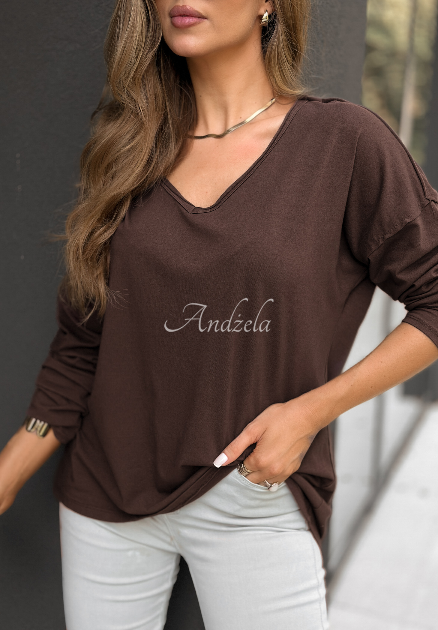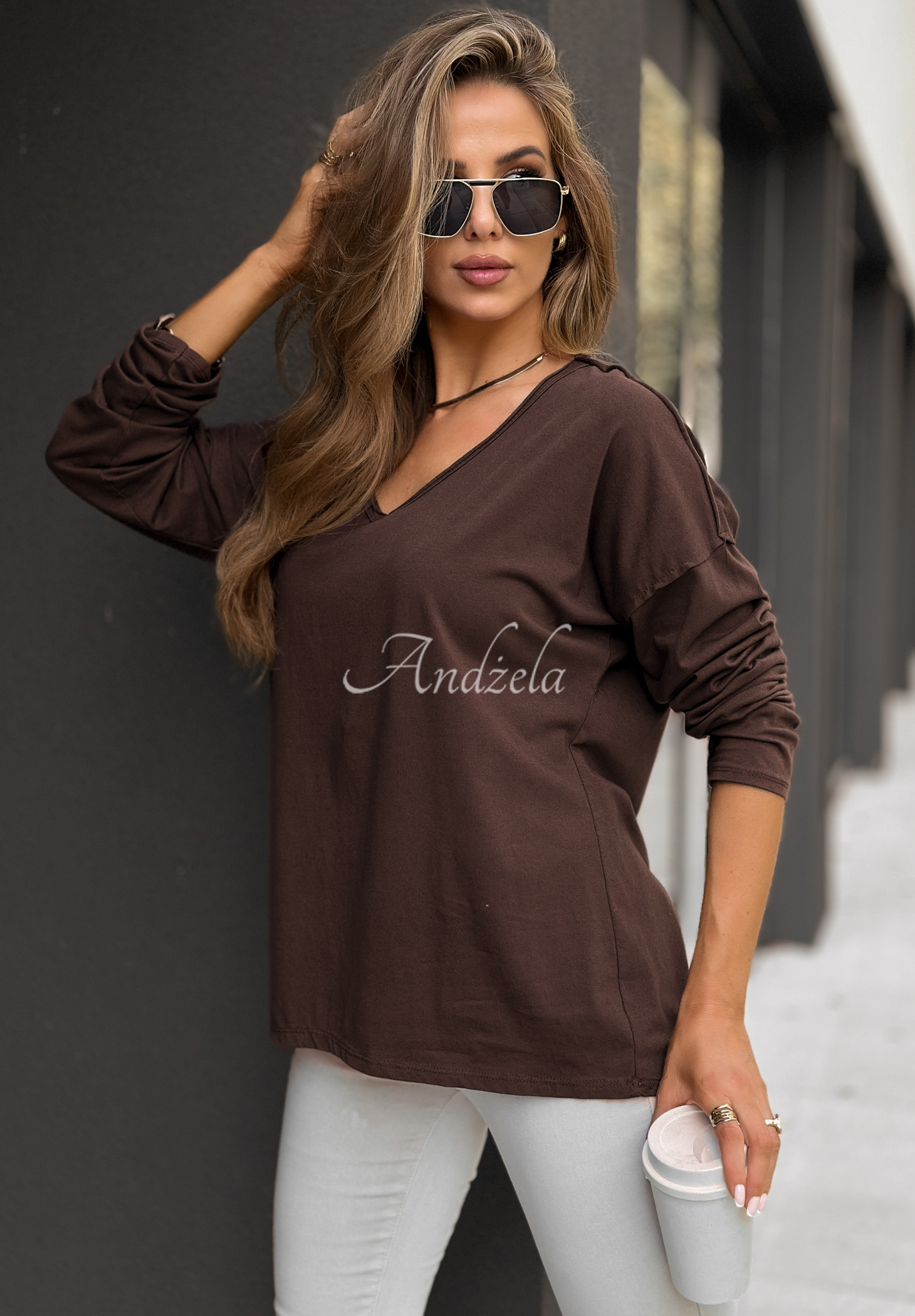 Bluză cu spatele ușor mai lung și linia umerilor coborâtă. Model oversize, realizat din bumbac elastic.* material elastic* decolteu în V* linia umerilor coborâtă* mâneci lungi* croială oversize* spate ușor mai lung