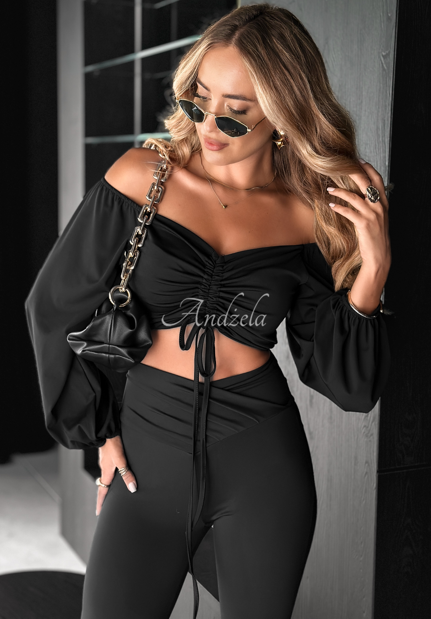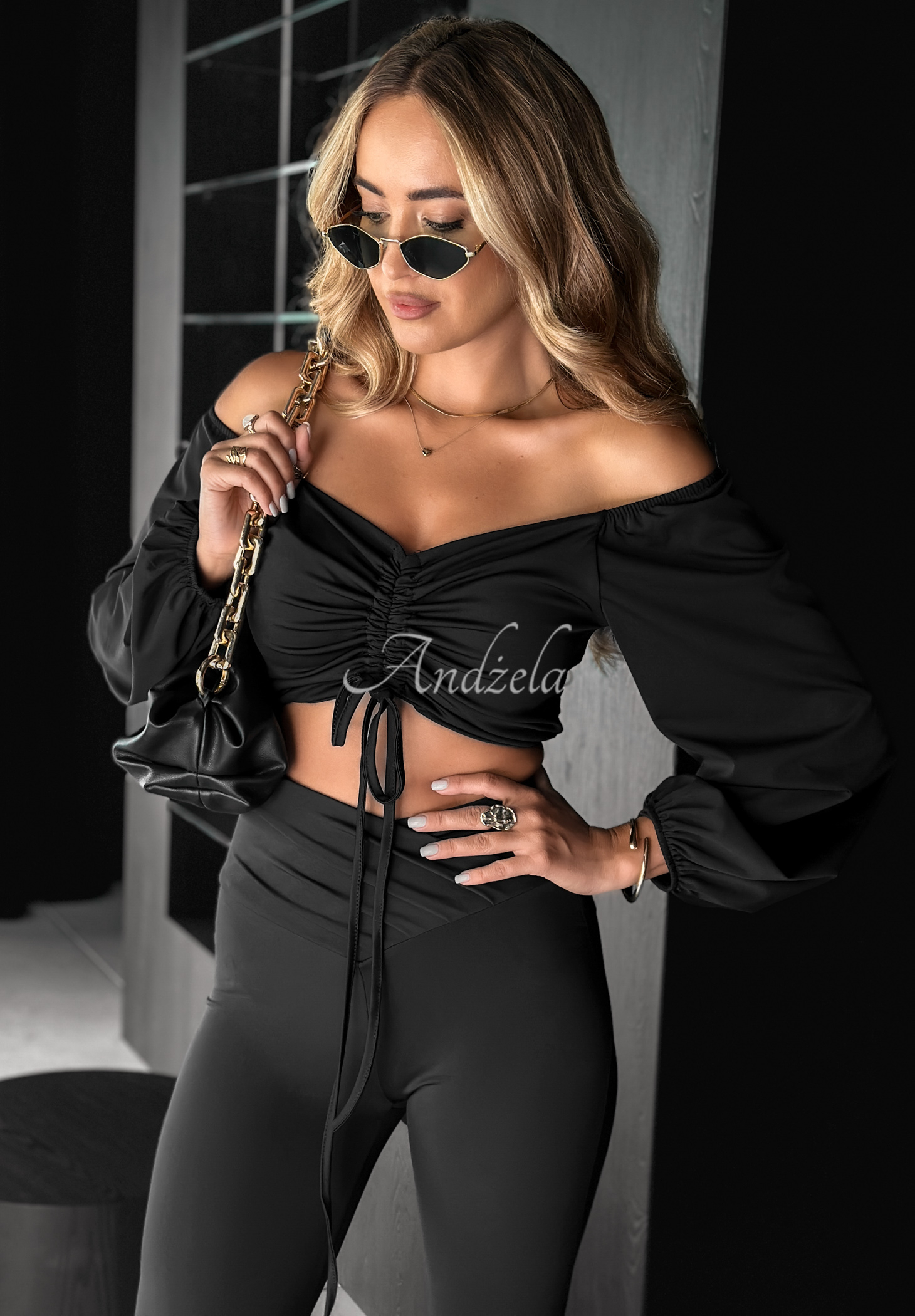 Bluză cu șnur reglabil în partea din față. Model cu croială scurtă și mâneci lungi terminate cu elastic.