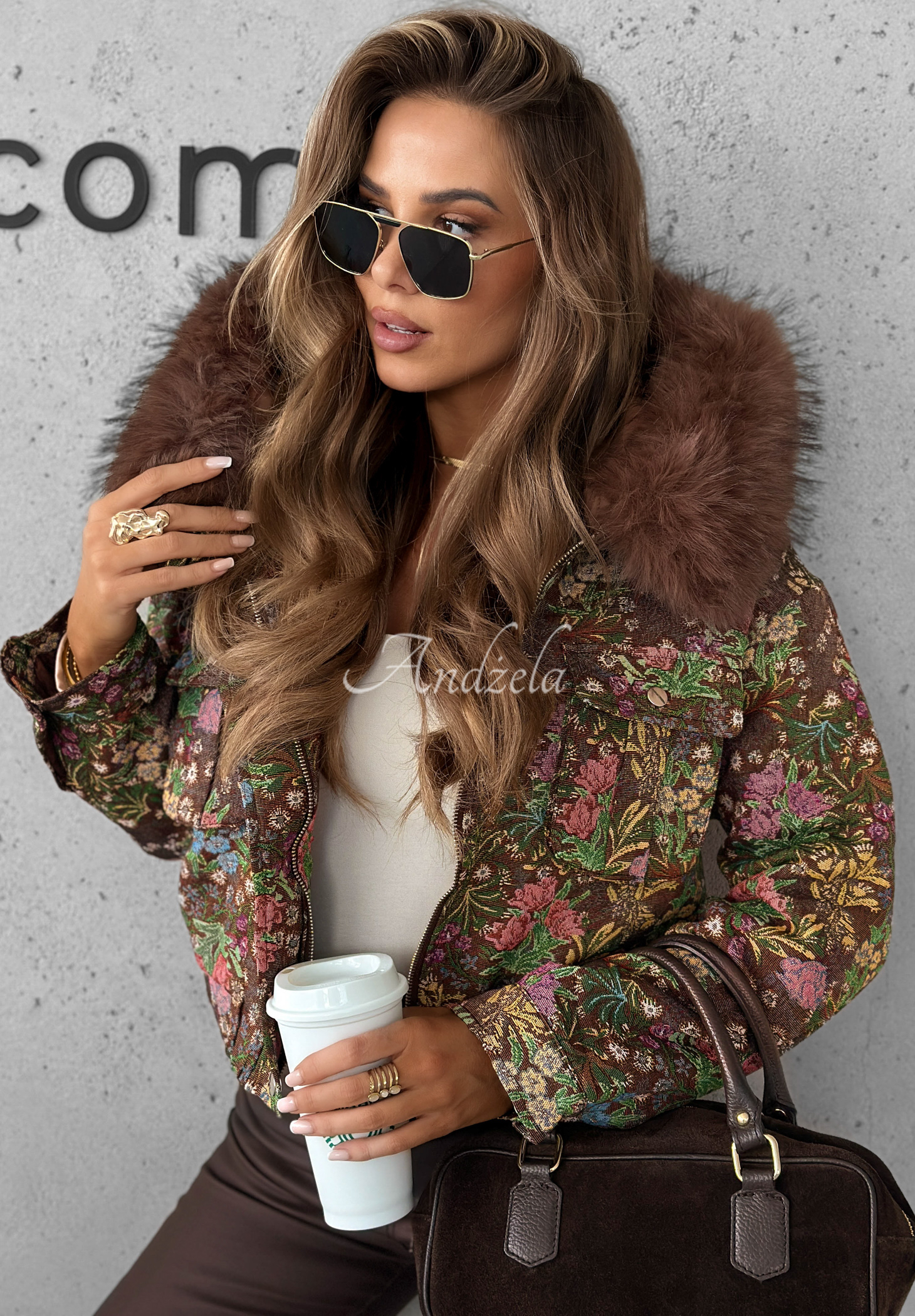 Geacă jacquard cu flori, confecționată din țesătură de bumbac. Este un model ușor căptușit cu puf sintetic, prevăzut cu glugă nedetașabilă și blană sintetică detașabilă. În partea de jos are elastic, iar la bust buzunare cu închidere.