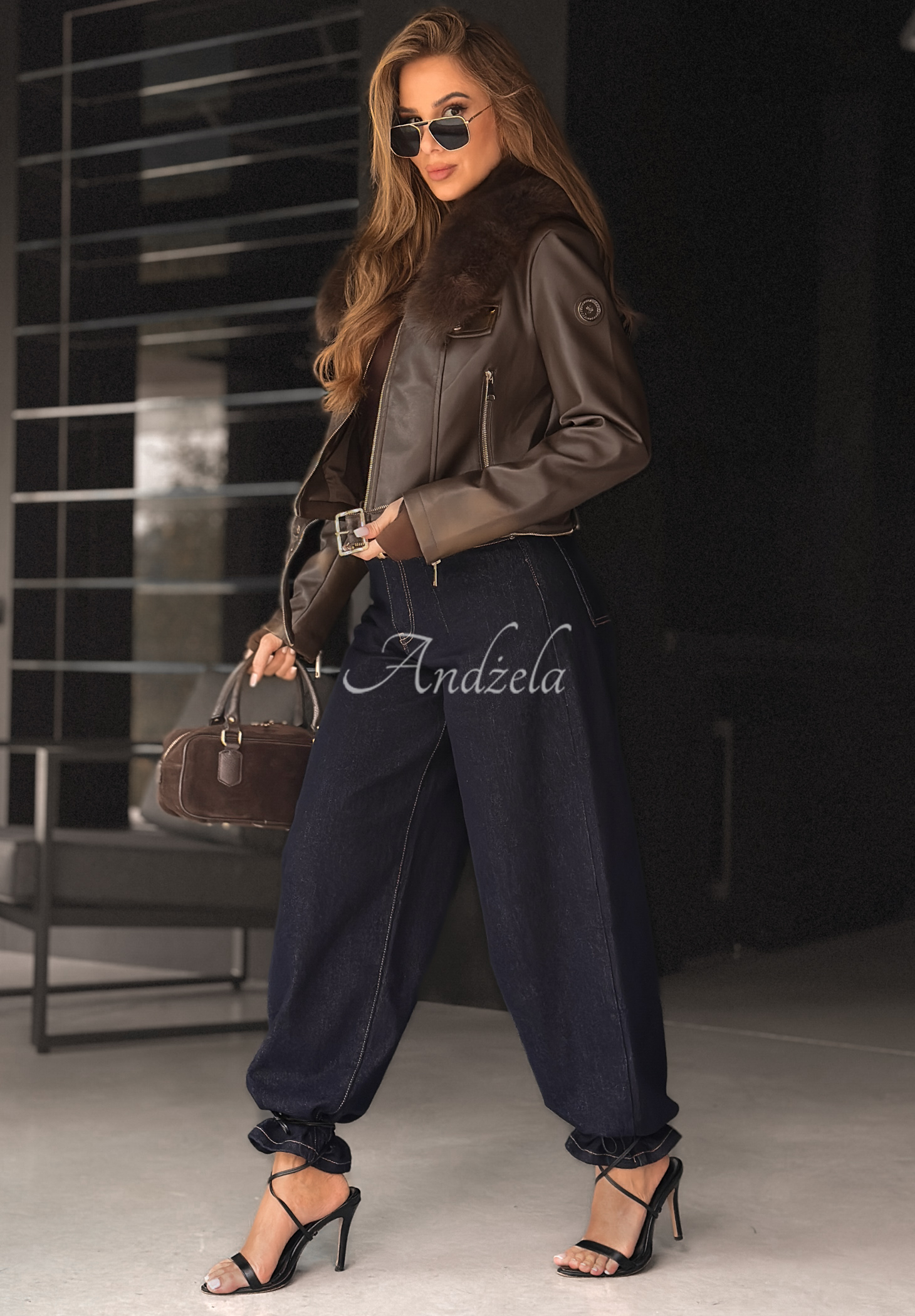 Geacă scurtă din imitație de piele, evidențiată prin blana sintetică detașabilă de la guler. Are buzunare funcționale cu fermoar în față. Modelul se închide cu fermoar auriu, dispune de curea reglabilă în partea de jos și detalii aurii.