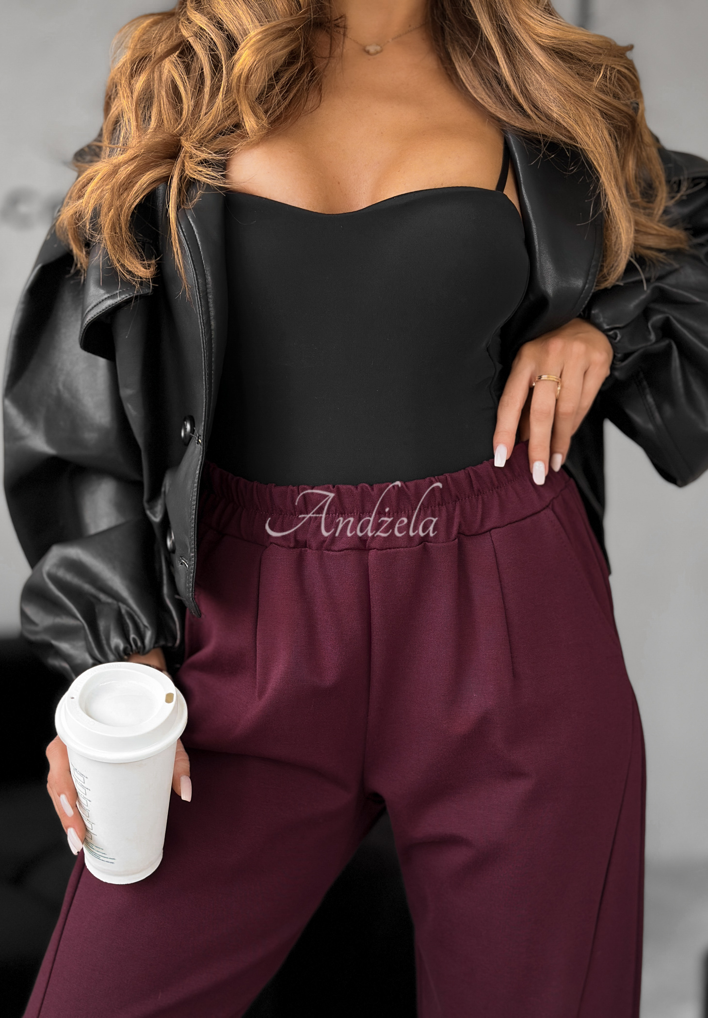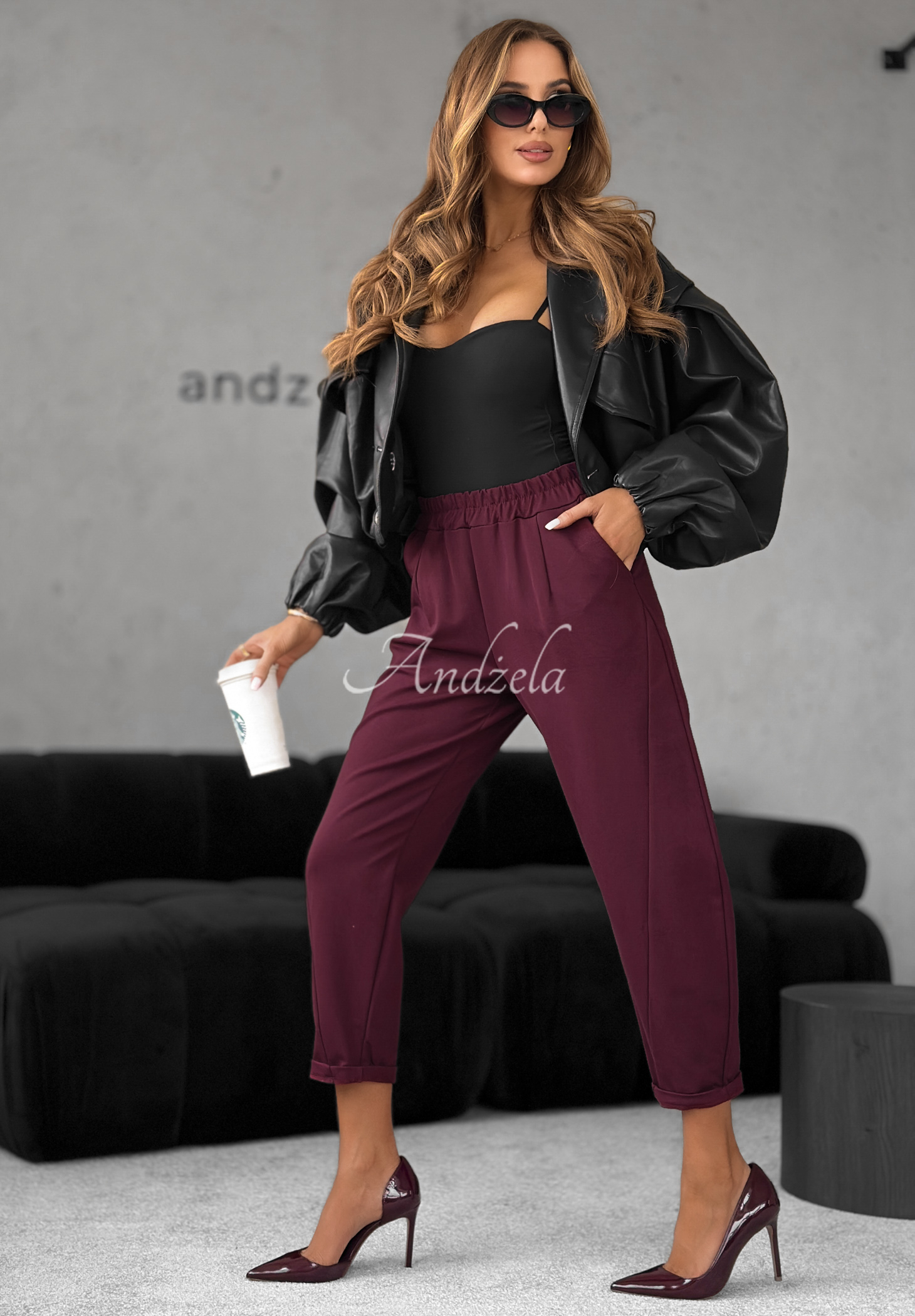 Pantaloni din material, cu o croiala la modă tip banană, confecționați dintr-o viscoză de calitate. Modelul are elastic în talie. În partea din față se află buzunare funcționale.