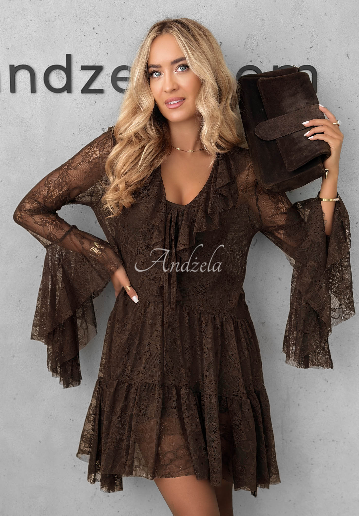 Rochie modernă, confecționată din material din dantelă. Model cu croială evazată, care se remarcă prin decolteul în V. Este decorată cu volănașe și are mâneci lungi, transparente, finisate amplu.