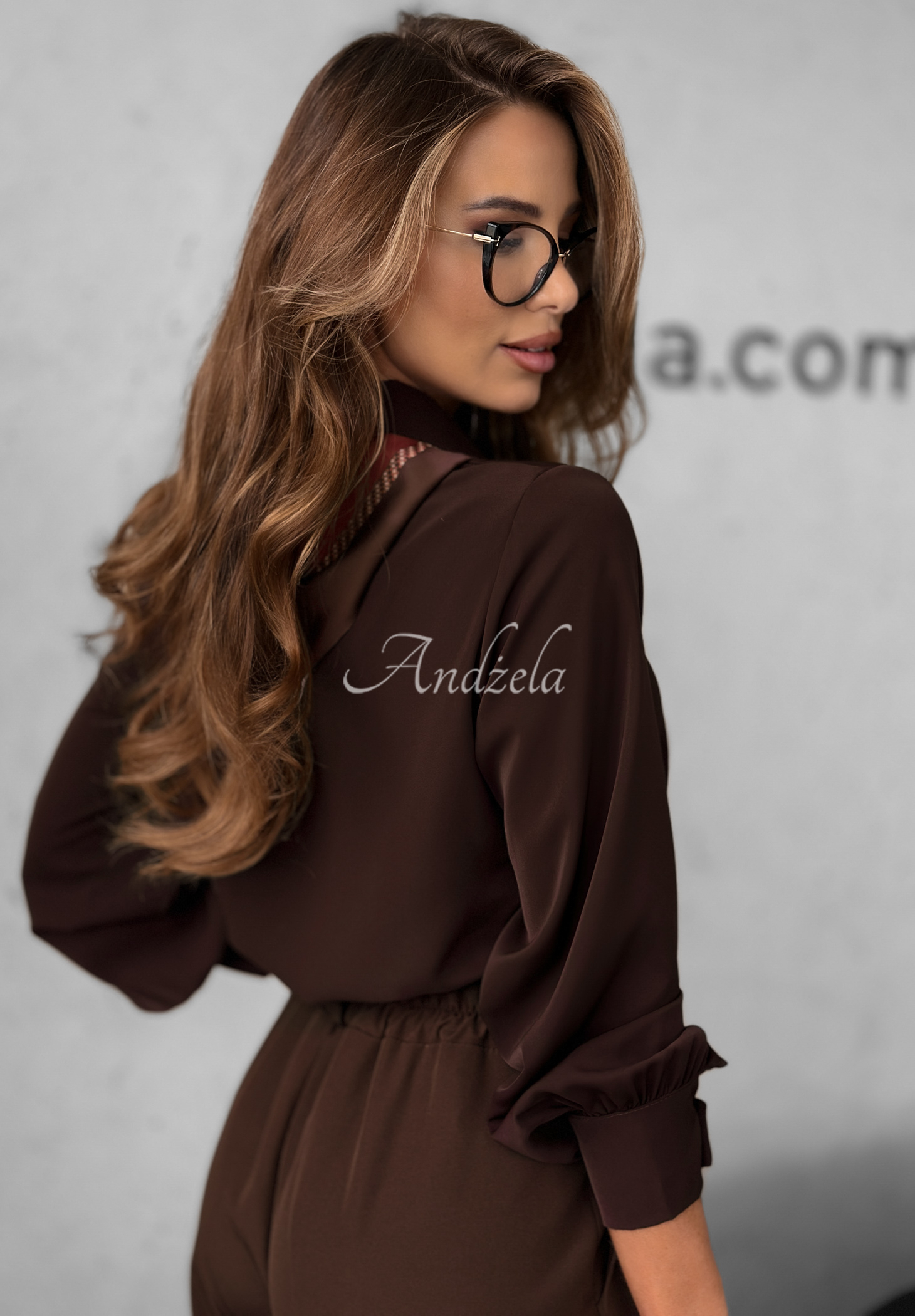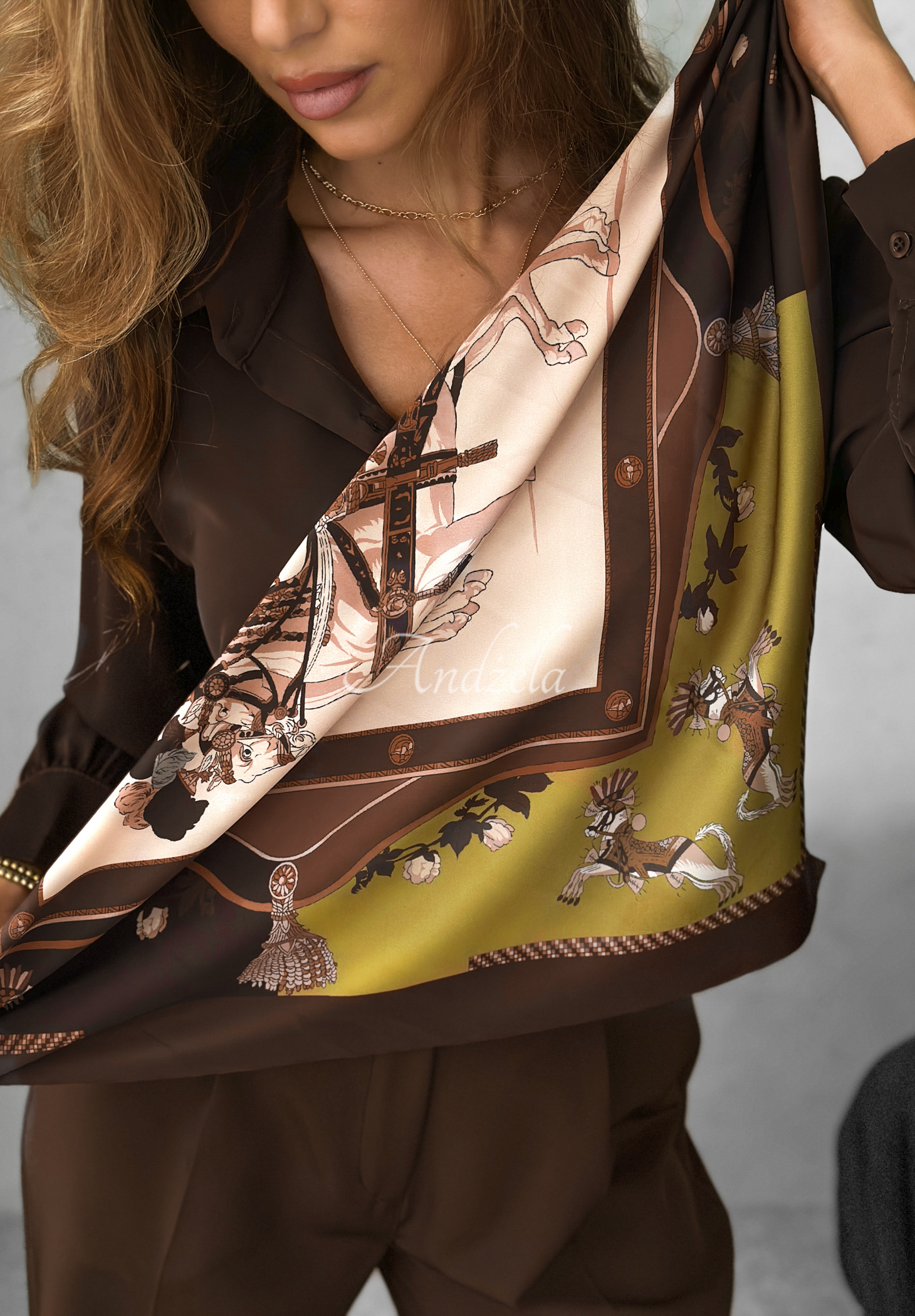 Cămașă lejeră, confecționată dintr-un material fin. Model cu croială clasică, guler și închidere cu nasturi. Are mâneci lungi terminate cu manșete, iar setul include o eșarfă cu imprimeu.
