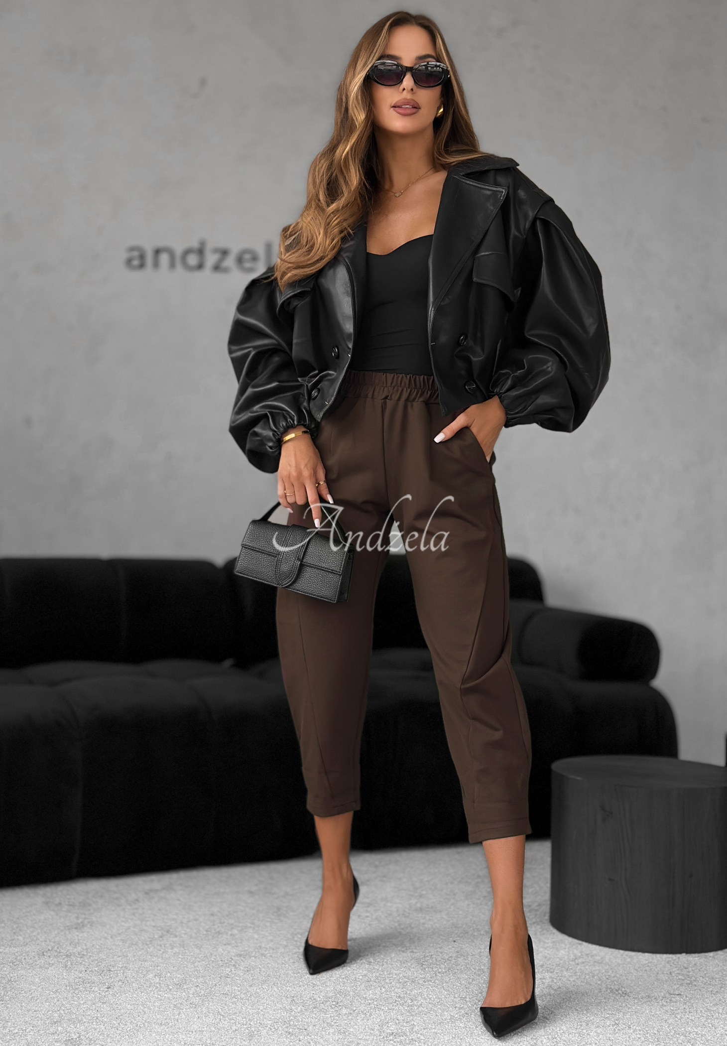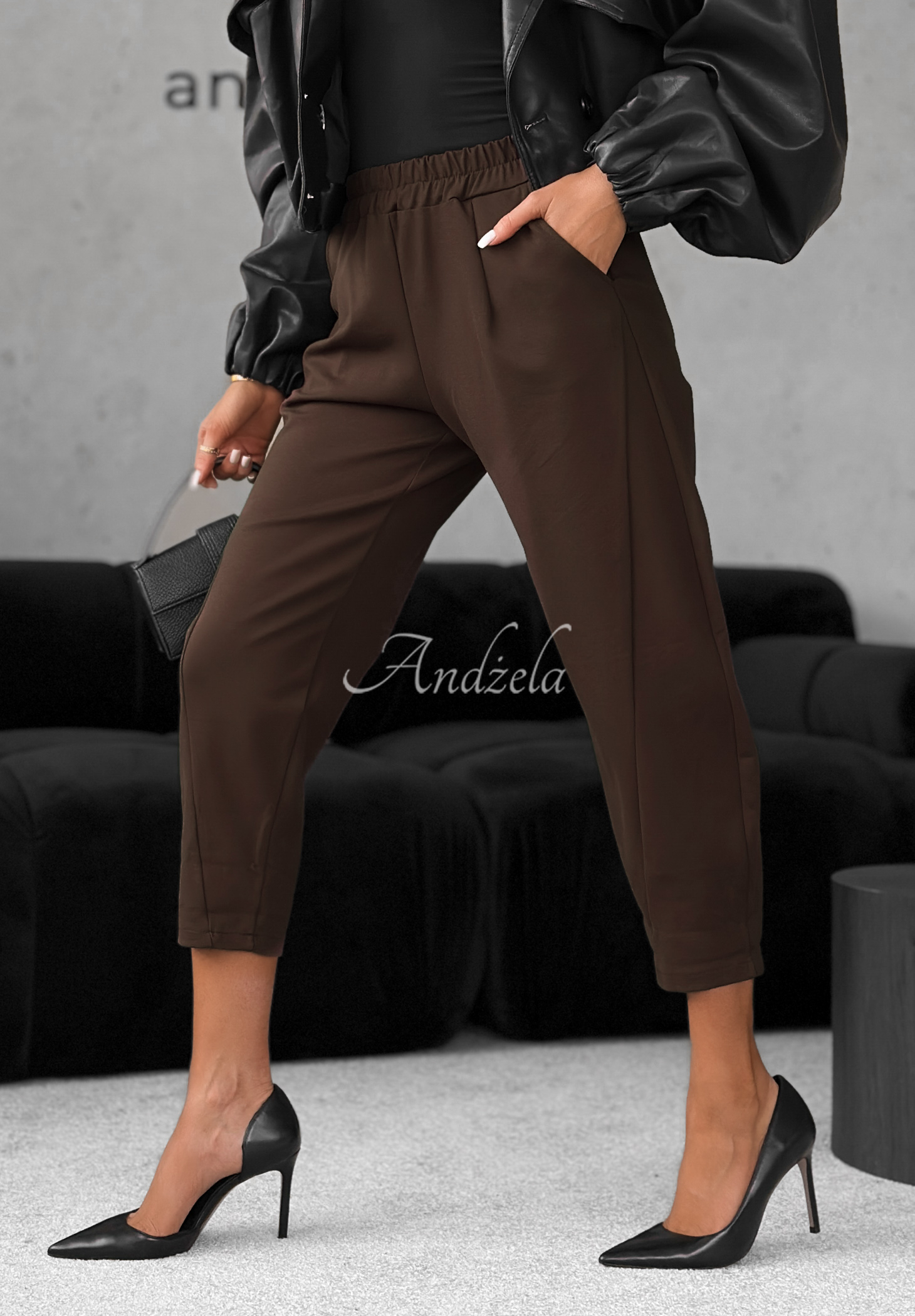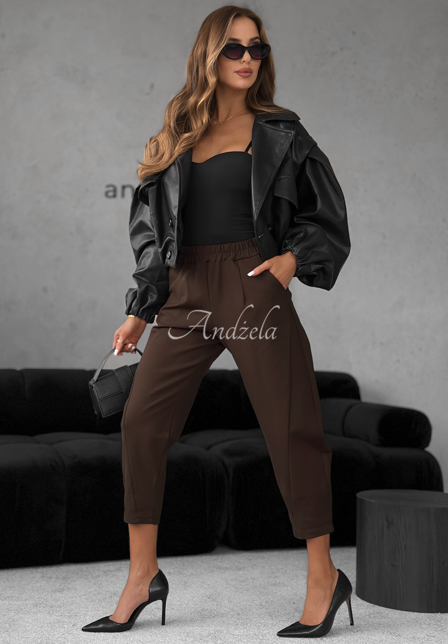 Pantaloni din material, cu o croiala la modă tip banană, confecționați dintr-o viscoză de calitate. Modelul are elastic în talie. În partea din față se află buzunare funcționale.