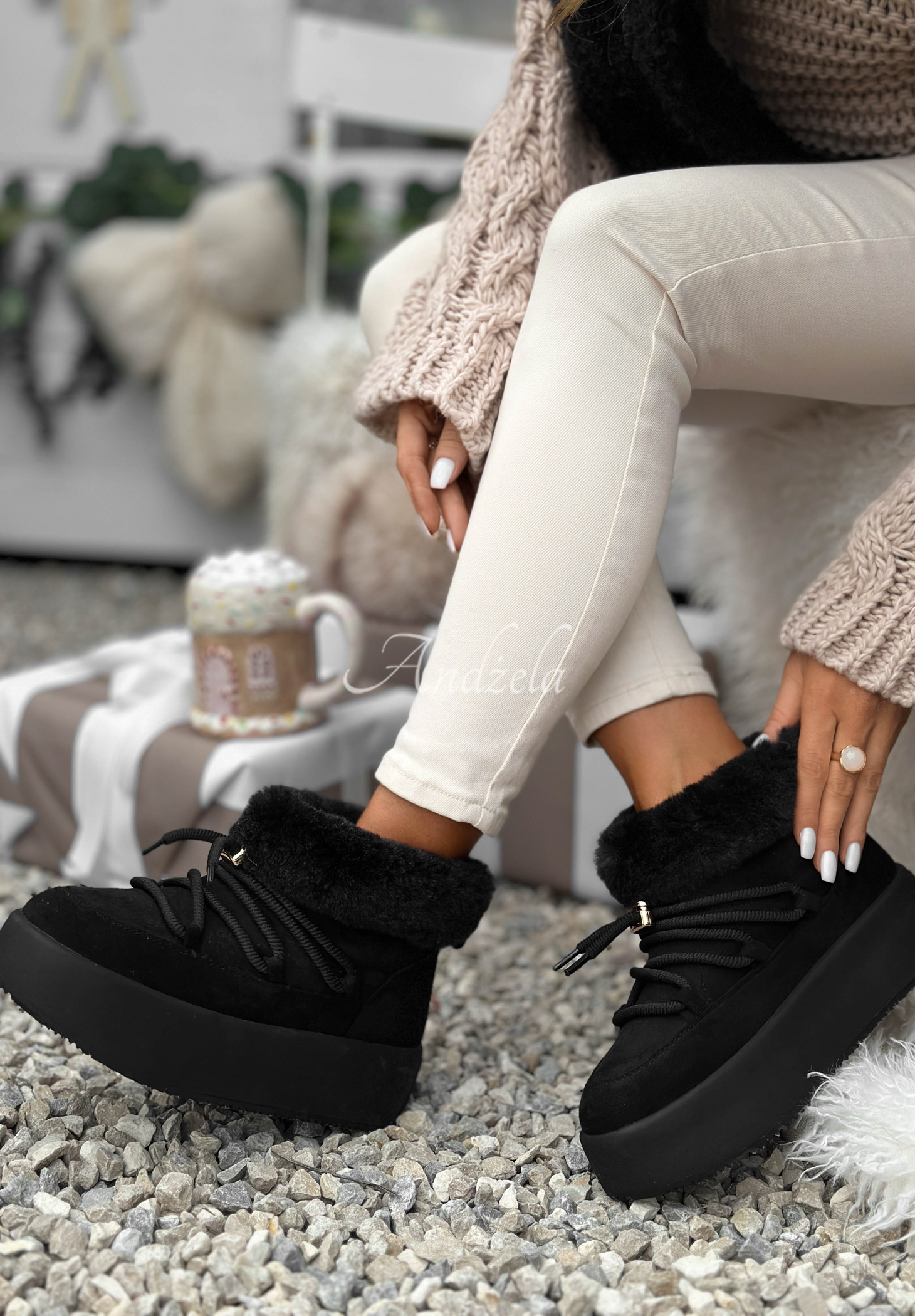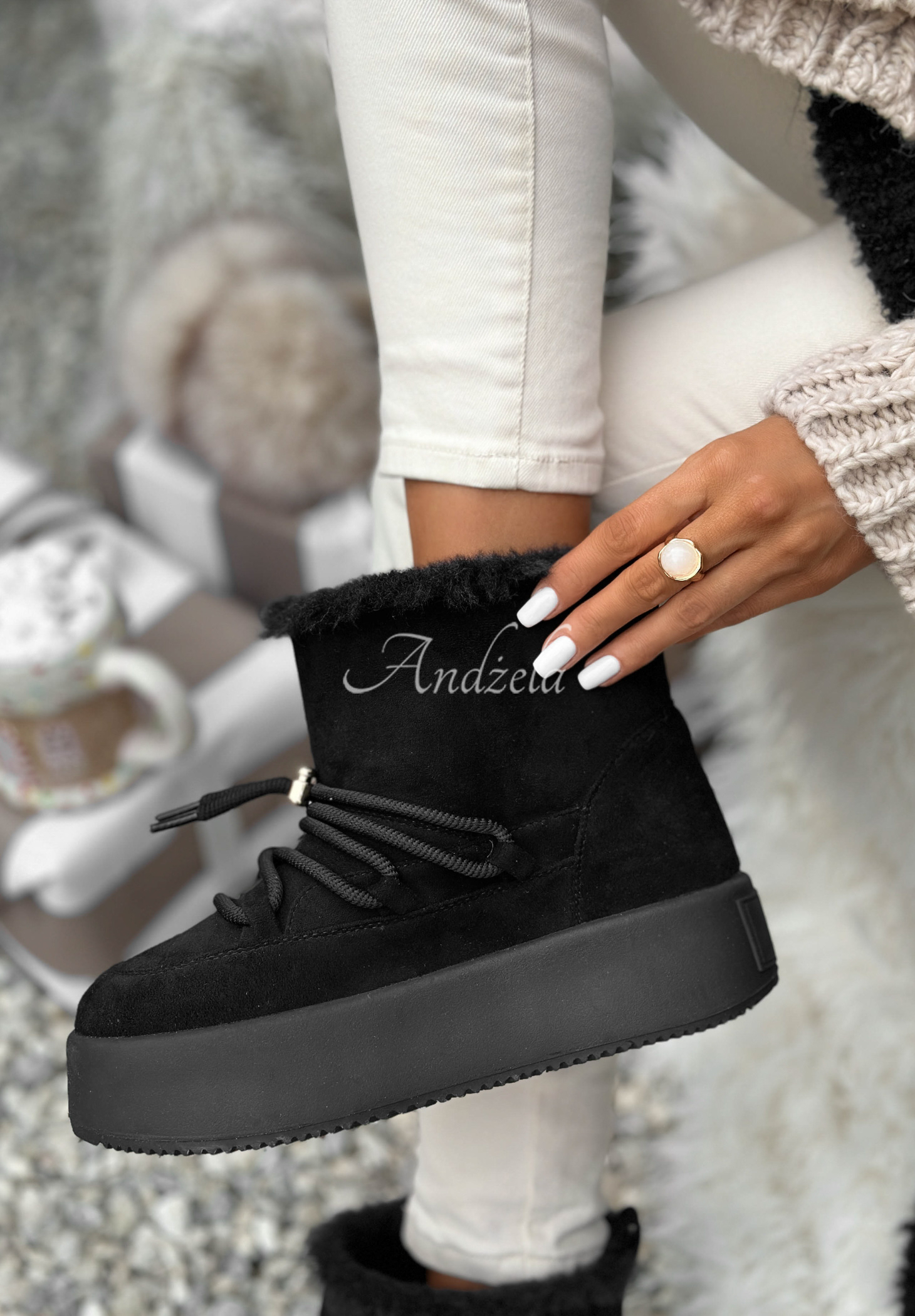 Cizme de zăpadă călduroase, confecționate din imitație de piele întoarsă. Model cu șireturi, așezat pe o talpă groasă din cauciuc, cu vârf rotunjit.
