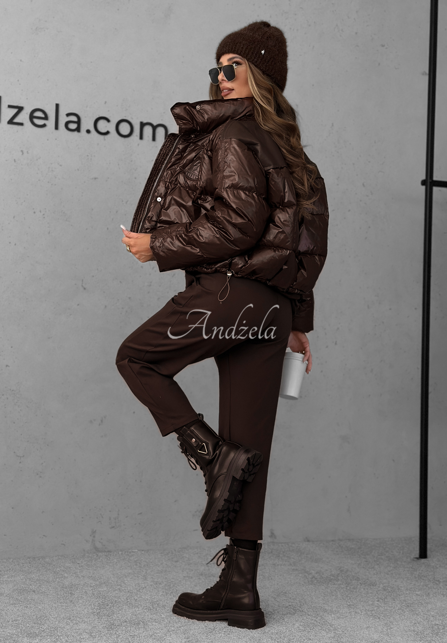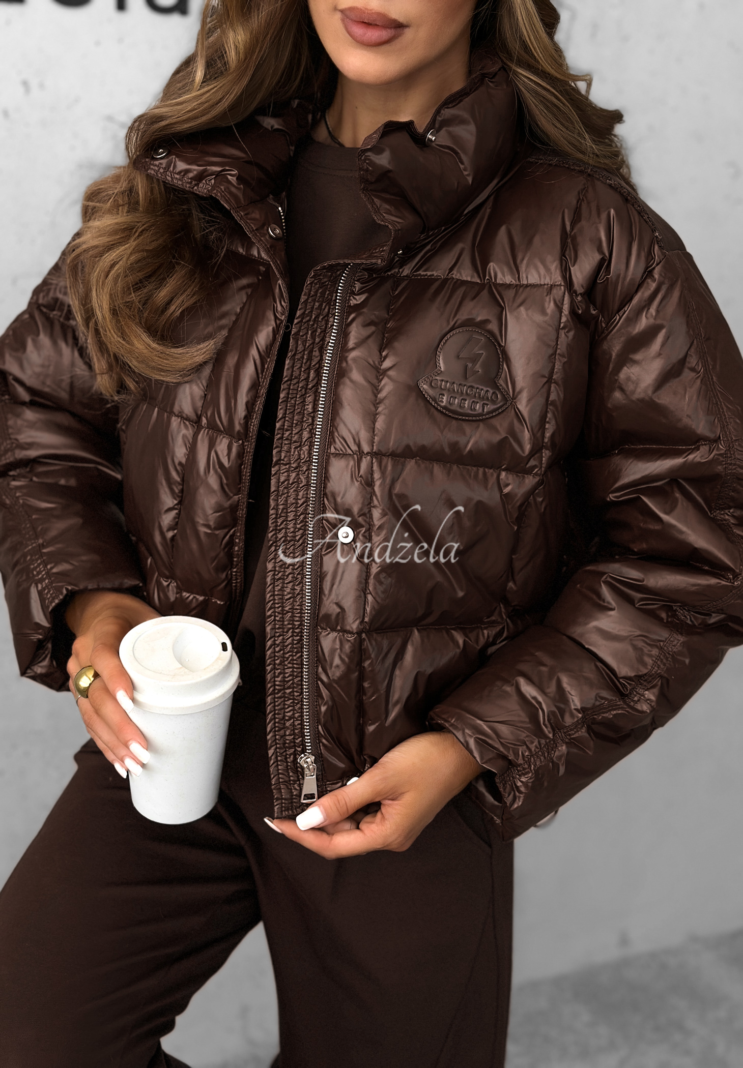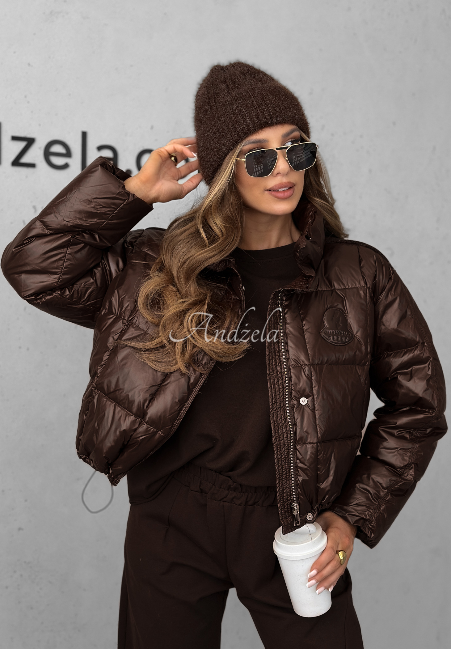 Geacă de puf cu fason scurt, umplută cu puf natural de rață. Se închide cu fermoar și capse, iar în partea din față are buzunare funcționale cu închidere. Model cu guler ridicat și șnur reglabil în partea de jos, decorat cu o aplicație subtilă în față.