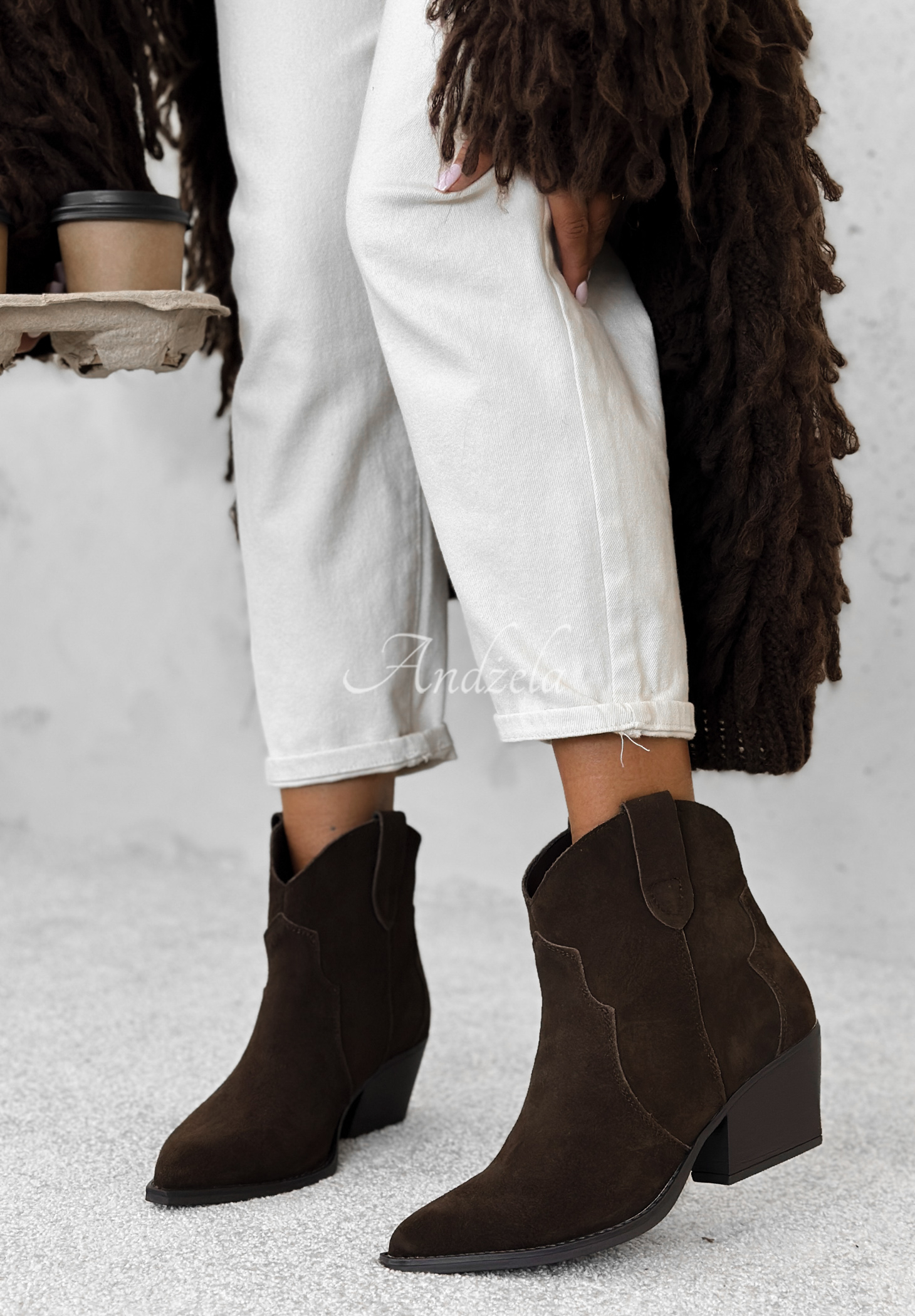 Botine cowboy confecționate din piele întoarsă naturală. Model cu vârf ascuțit, așezat pe toc oblic. Este ușor căptușit și nu are închidere.* piele naturală întoarsă* toc oblic* vârf ascuțit* fără închidere* ușor căptușite