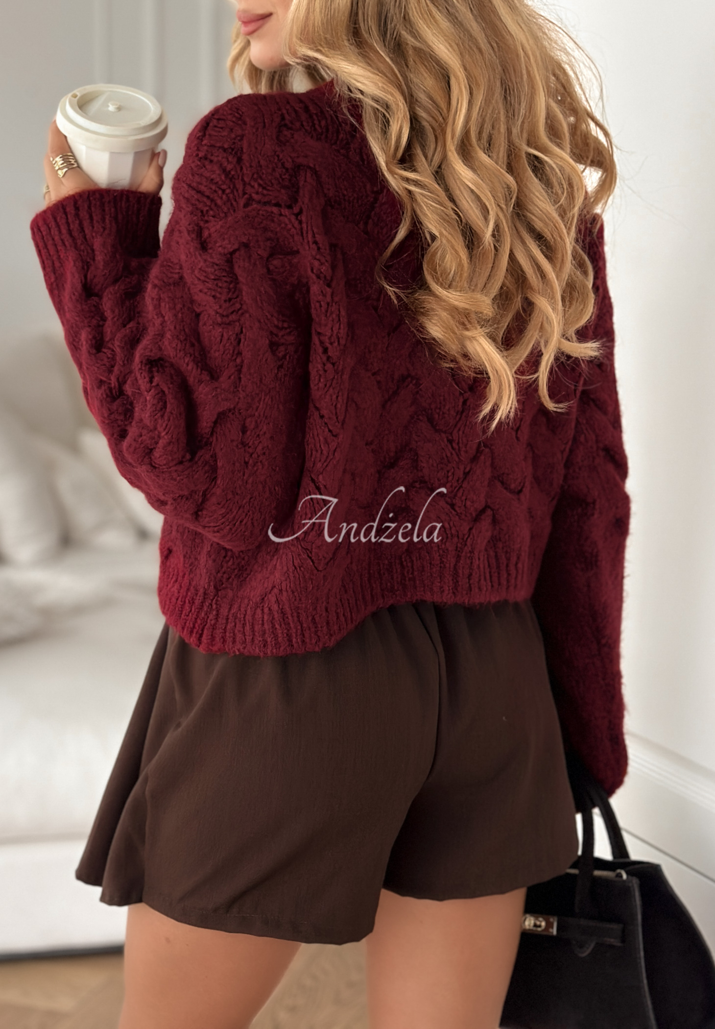 Pulover moale, cu tricotaj gros și decorativ, confecționat din material cu adaos de lână și viscoză. Are croială scurtă, decolteu rotund și manșete elastice la mâneci și în partea de jos.