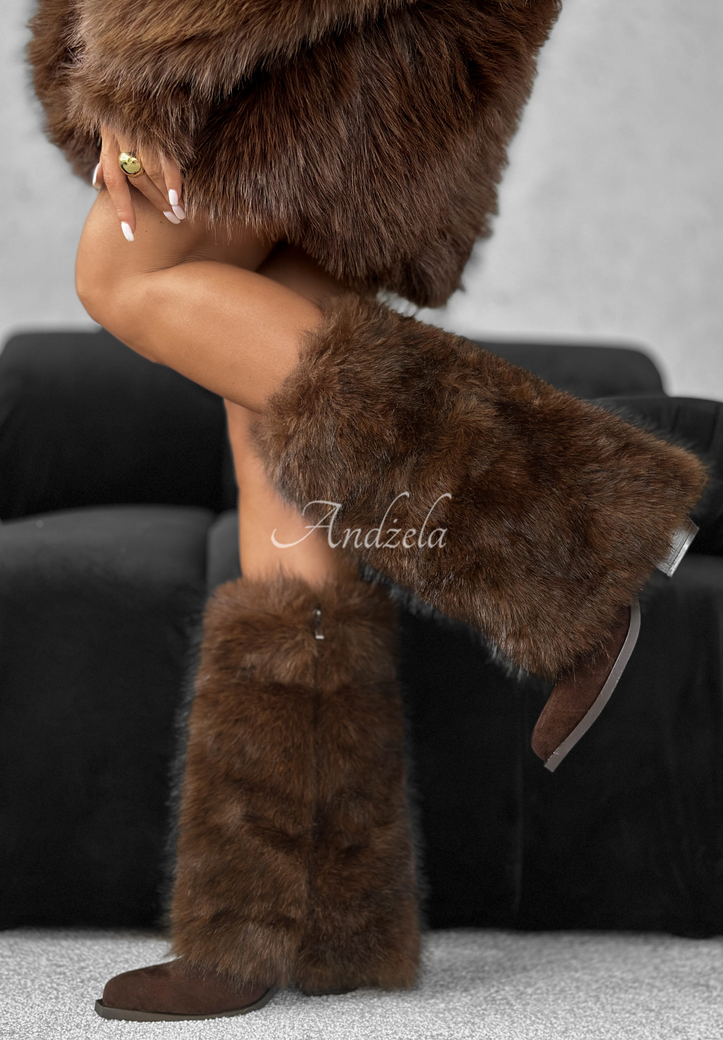 Botine din imitație de piele întoarsă, cu vârf ascuțit și toc mediu. Model moale și plăcut la atingere, decorat cu blăniță sintetică nedetașabilă. Se închid cu fermoar lateral.