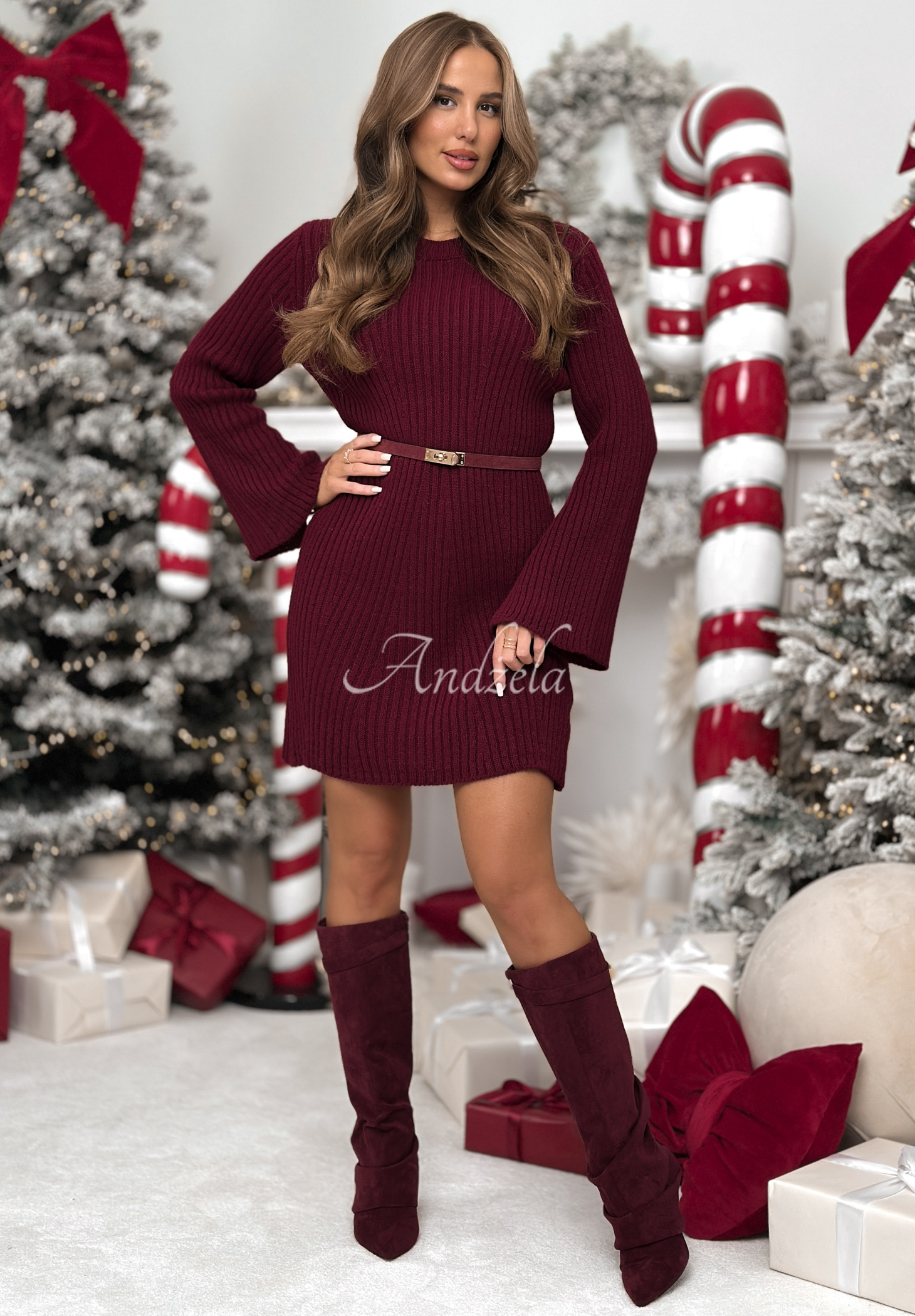 Rochie tip pulover, de lungime mini, realizată dintr-un material elastic. Este un model cu decolteu rotunjit și mâneci lungi evazate.