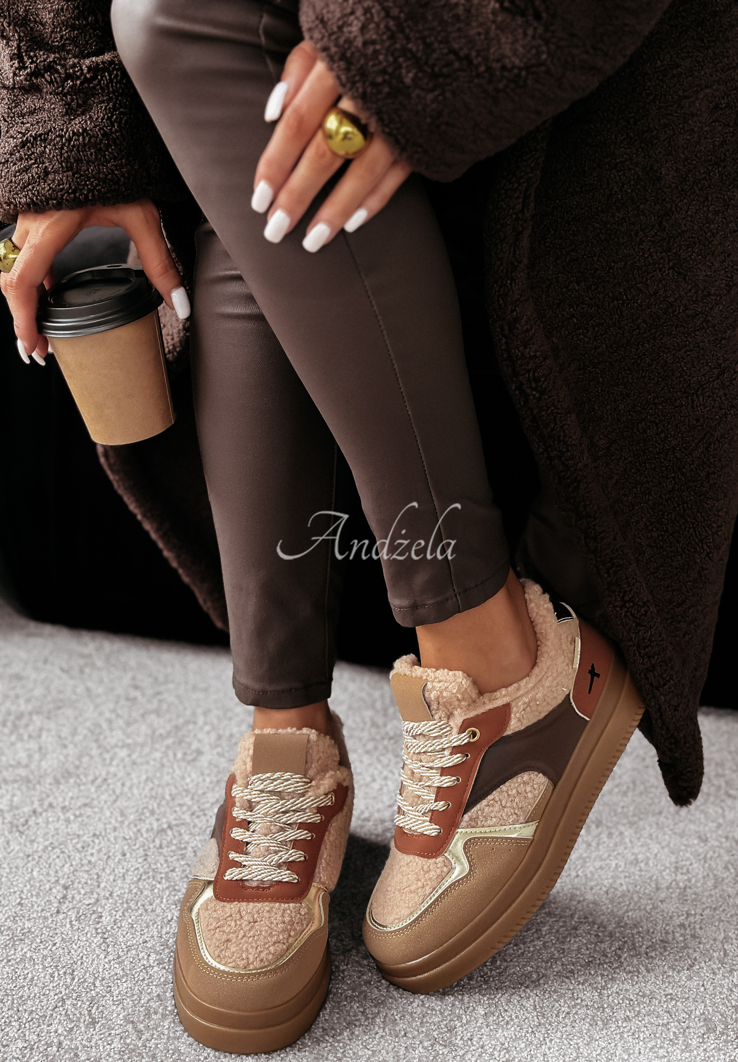 Adidași îmblăniți, cu interior din material moale tip blăniță. Se remarcă prin detaliile aurii și inserțiile care imită pielea. Model cu șireturi, vârf rotunjit și carâmb scurt, așezat pe o talpă mai înaltă din cauciuc.