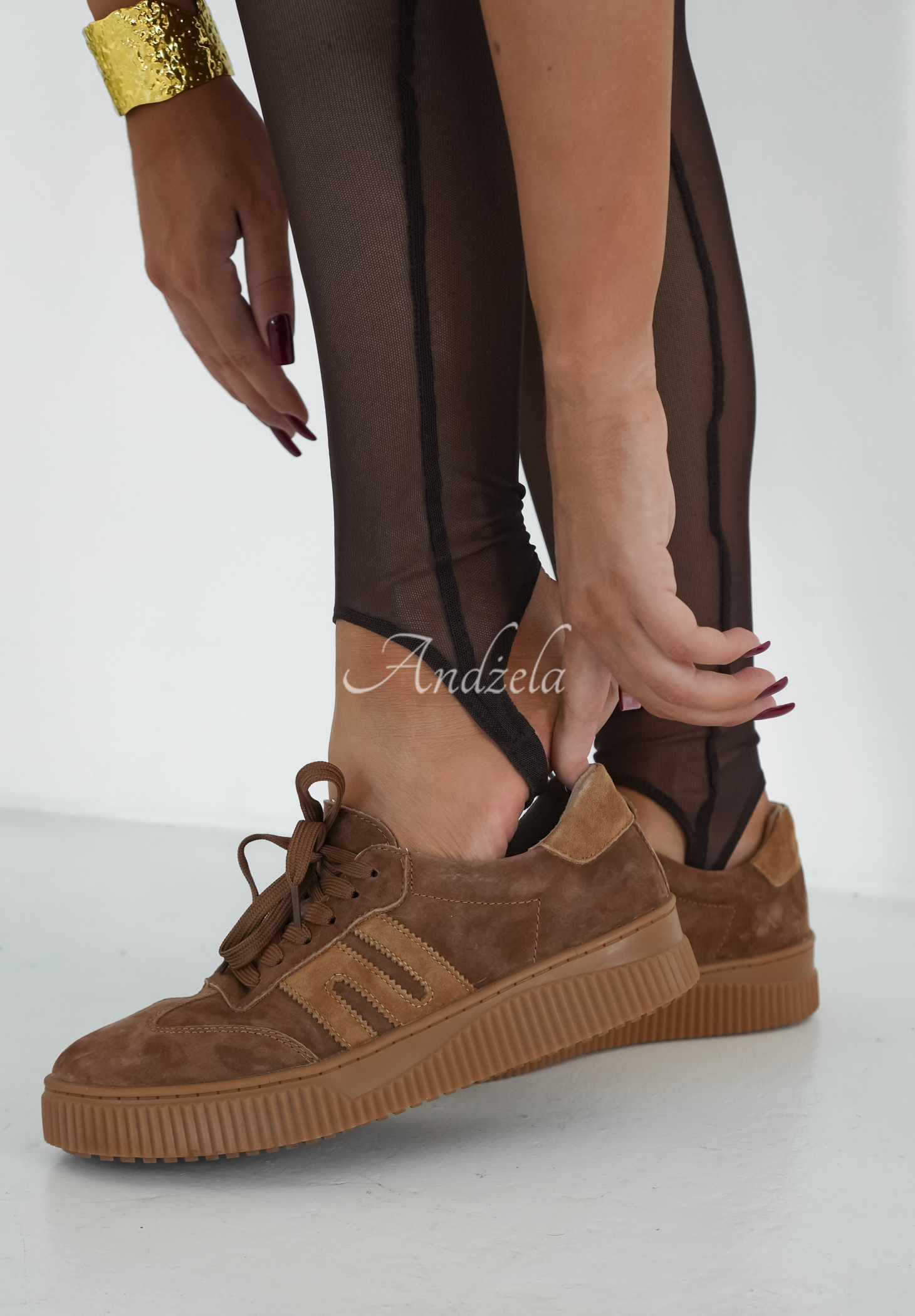 Colanți spectaculoase, confecționate din plasă delicată. Model cu barete la călcâi și talie prevăzută cu bandă elastică lată. Are căptușeală sub formă de pantaloni scurți, iar materialul elastic se mulează perfect pe siluetă, evidențiind-o elegant.