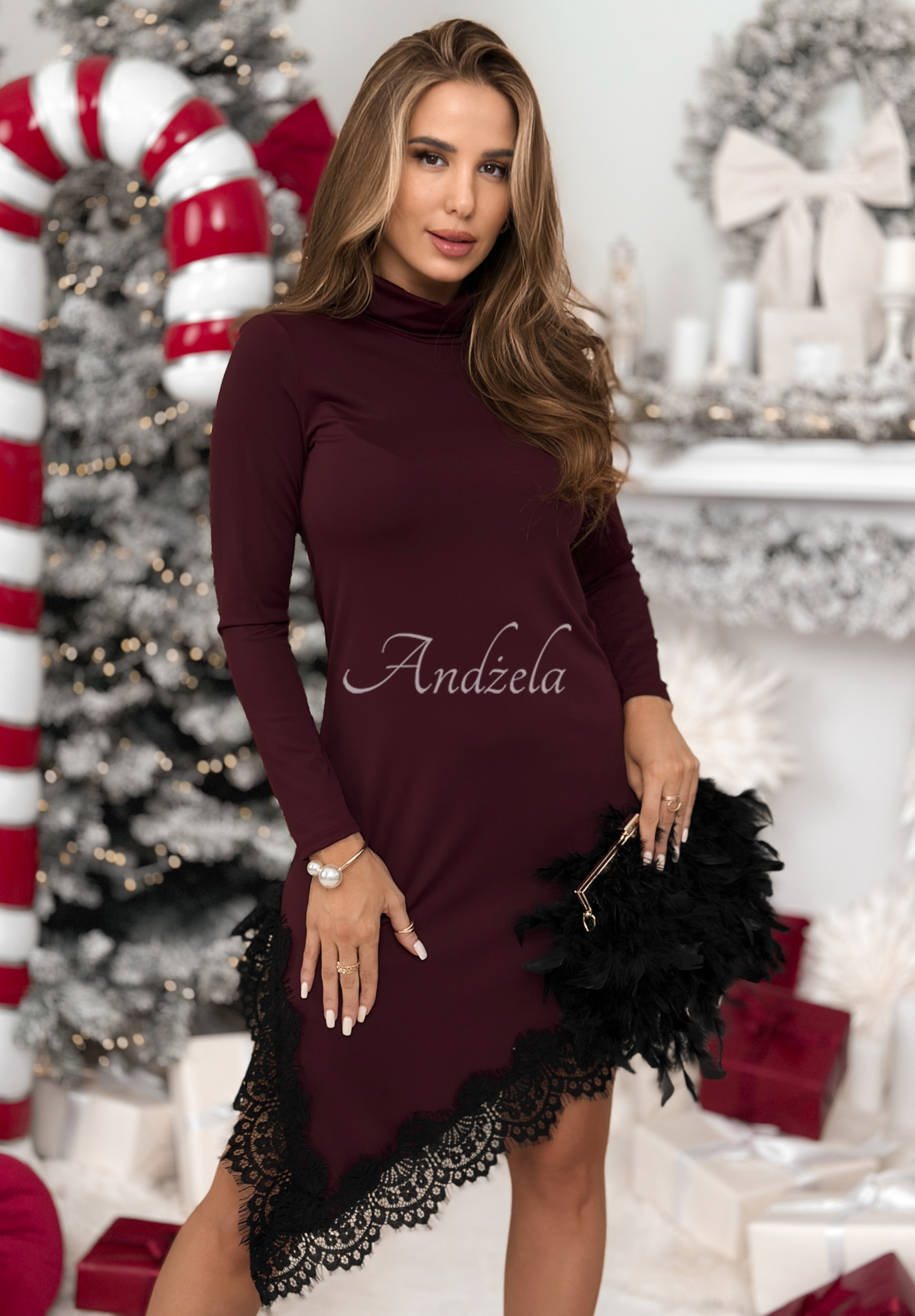 Rochie asimetrică cu guler înalt, realizată dintr-o țesătură foarte plăcută și elastică. Model cu croială mulată, care se remarcă prin materialul din dantelă decorativă în partea de jos.