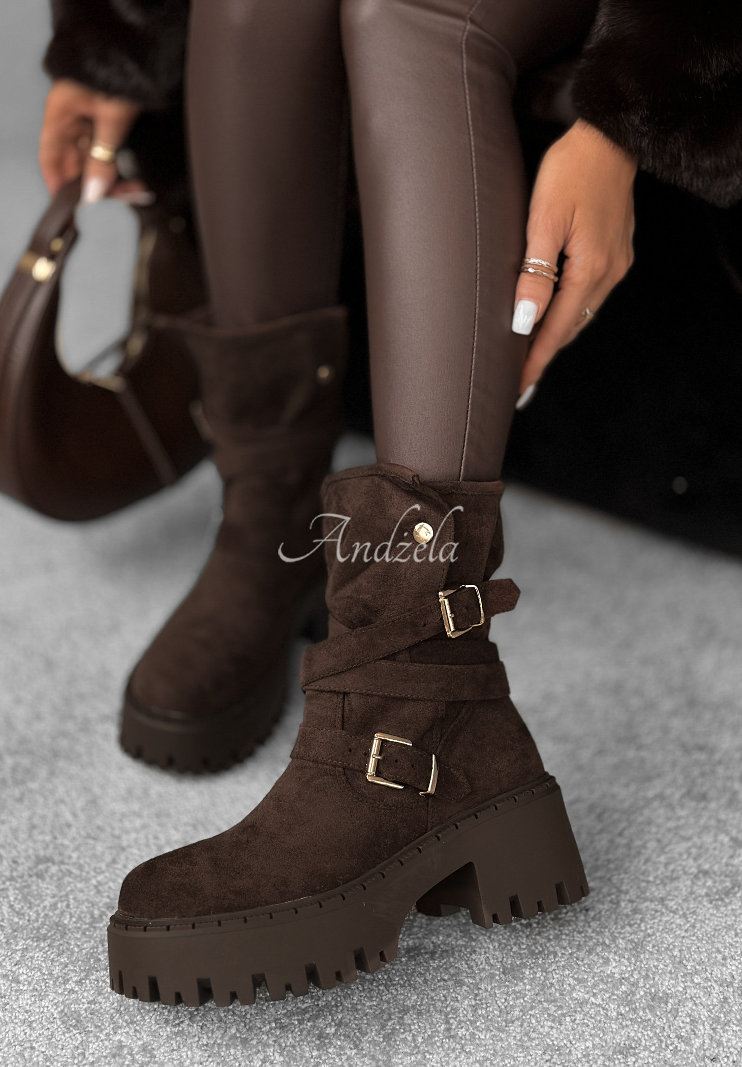 Botine din piele întoarsă, care se remarcă prin benzile decorative prevăzute cu catarame. Este un model cu talpă înălțată și vârf rotunjit. Are închidere cu capse, plasate pe laterale.