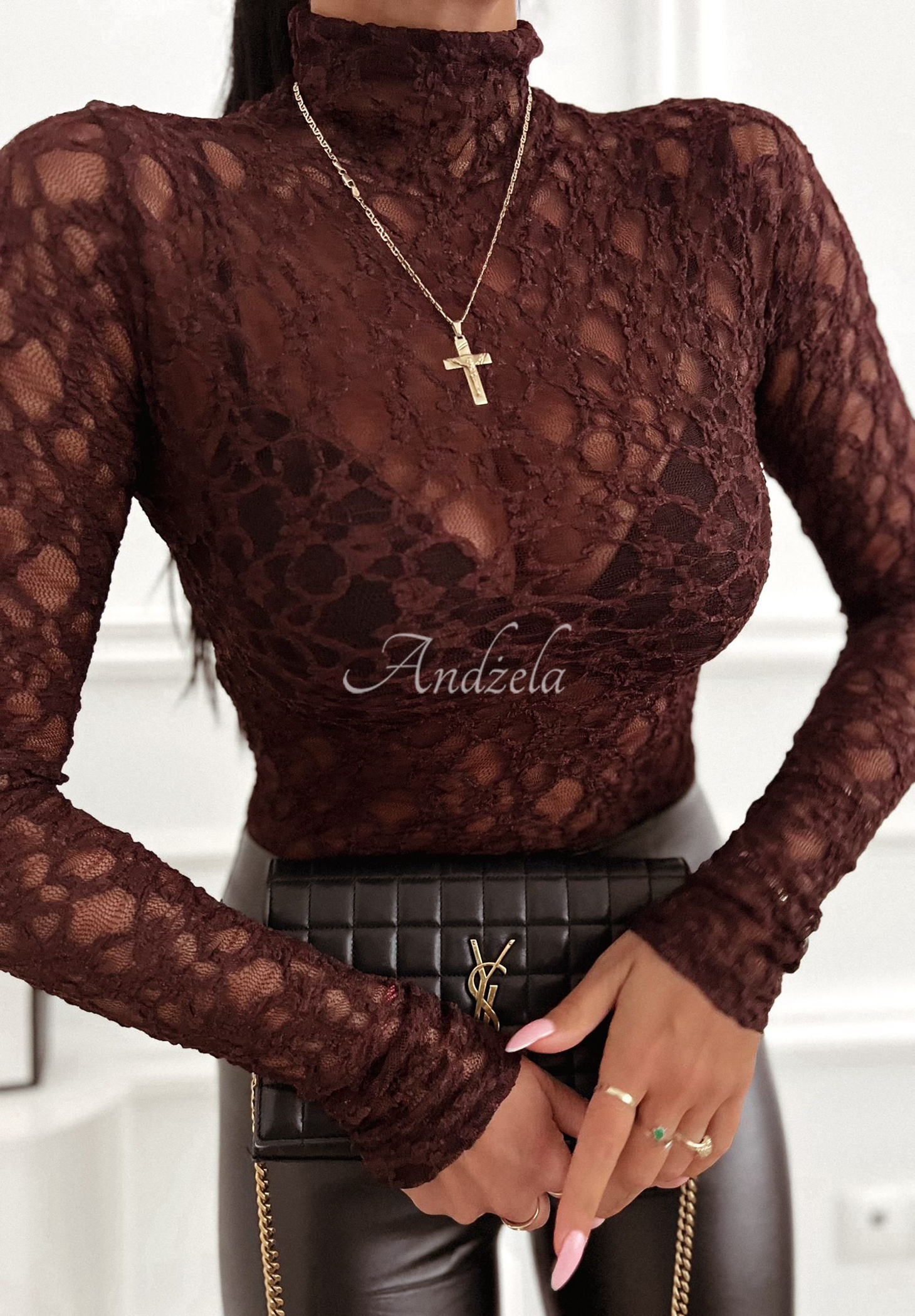 Bluză cu croială clasică, mâneci lungi și guler ridicat. Este confecționată din dantelă moale, transparentă.* material elastic* dantelă transparentă* mâneci lungi* guler ridicat