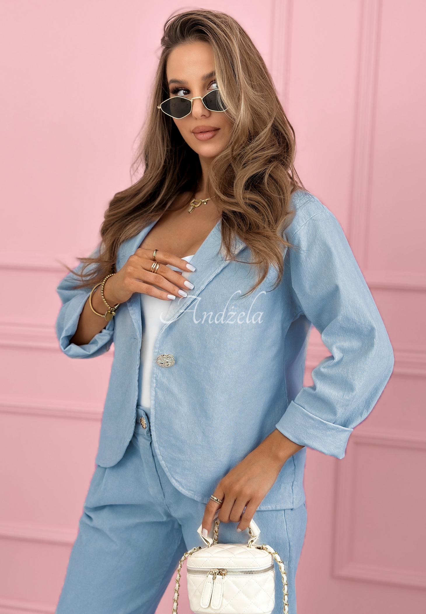 Sacou din catifea reiată, realizat din material de bumbac ușor elastic. Model cu guler, cu închidere cu nasture auriu. Se potrivește perfect în combinație cu pantalonii din linia „Goodbye Lovely”.