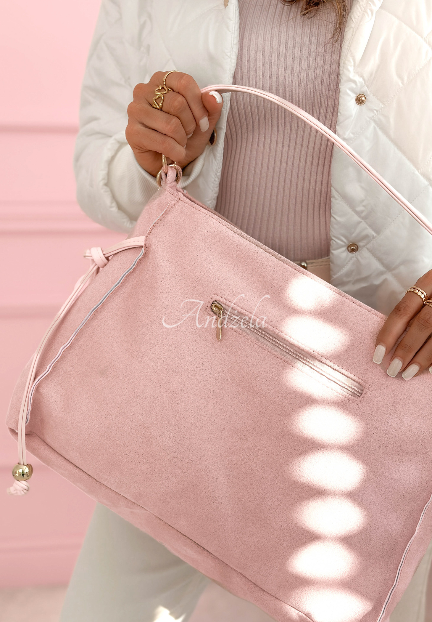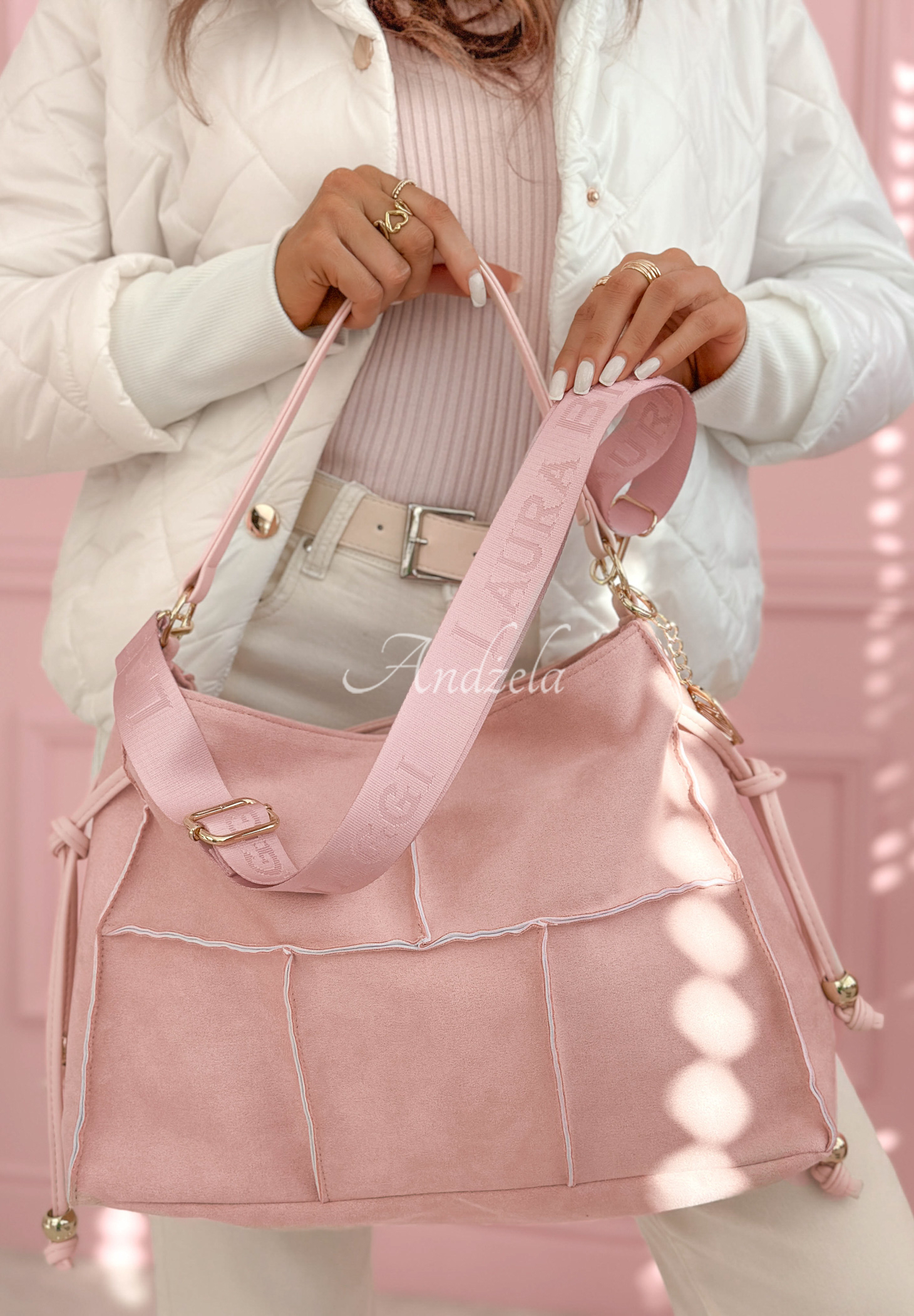 Geantă cu cusături decorative, realizată din piele ecologică. Model încăpător, cu un singur compartiment și închidere cu fermoar. Dispune de mâner nedetașabil și curea detașabilă. În interior și la exterior se află câte un buzunar cu fermoar. Designul este completat de detalii aurii.