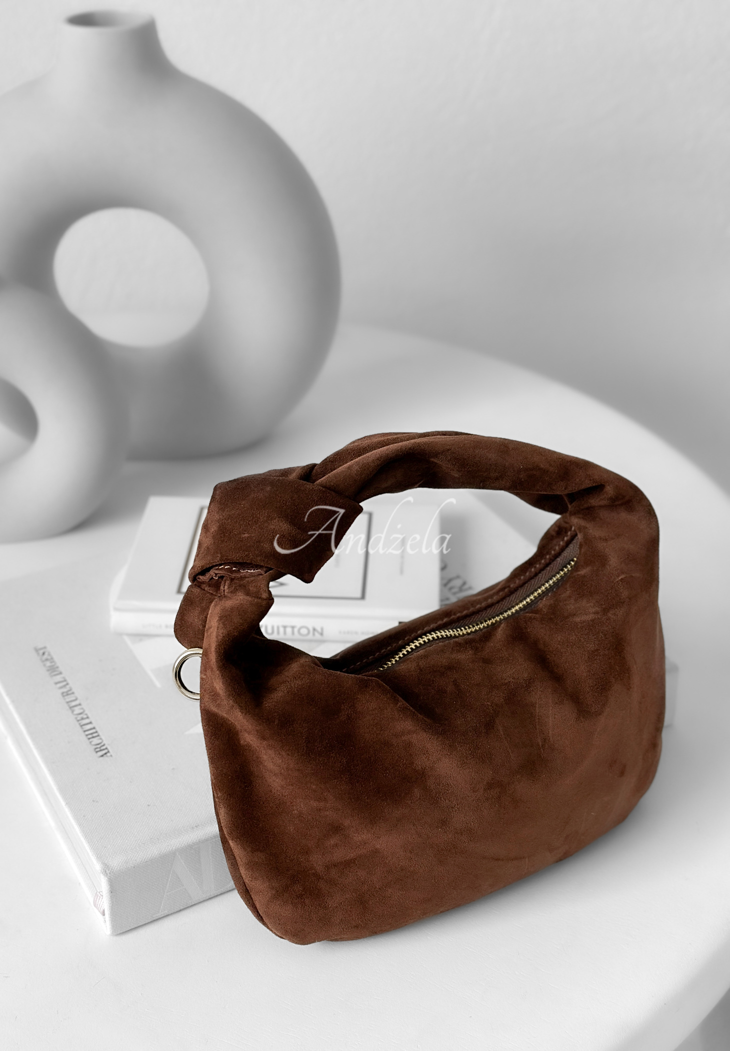 Geantă din piele întoarsă naturală, de înaltă calitate. Model cu un singur compartiment, închis cu fermoar. Dispune de mâner nedetașabil, curea reglabilă și un buzunar interior cu închidere. Este completată de detalii aurii elegante.