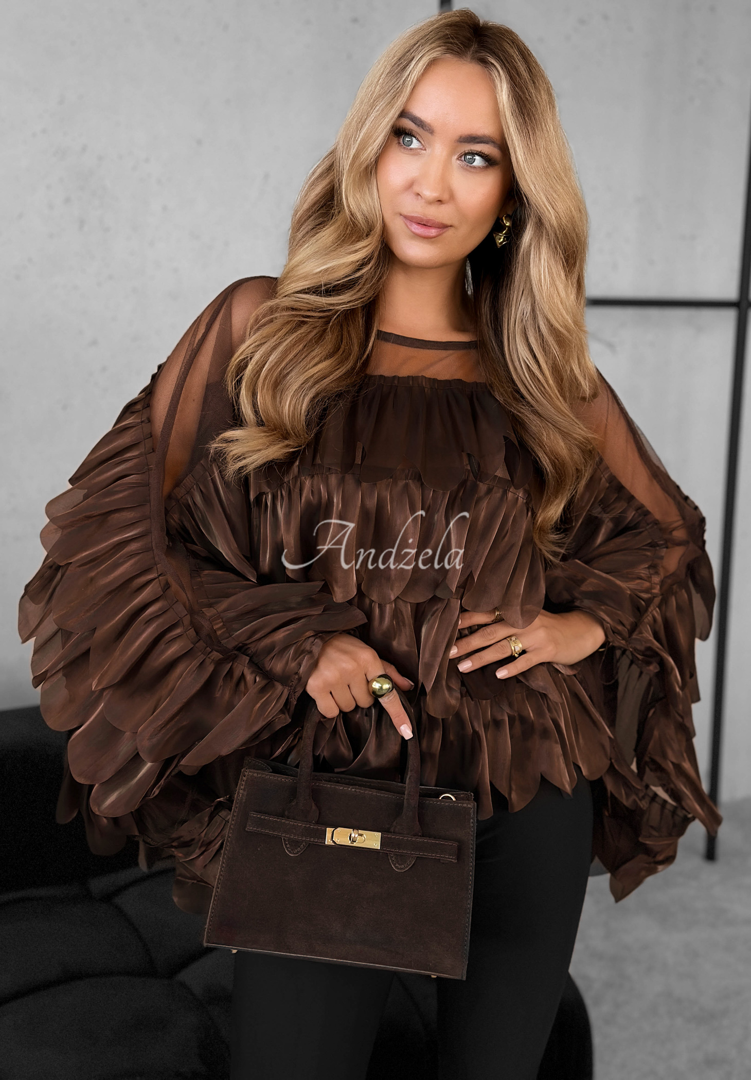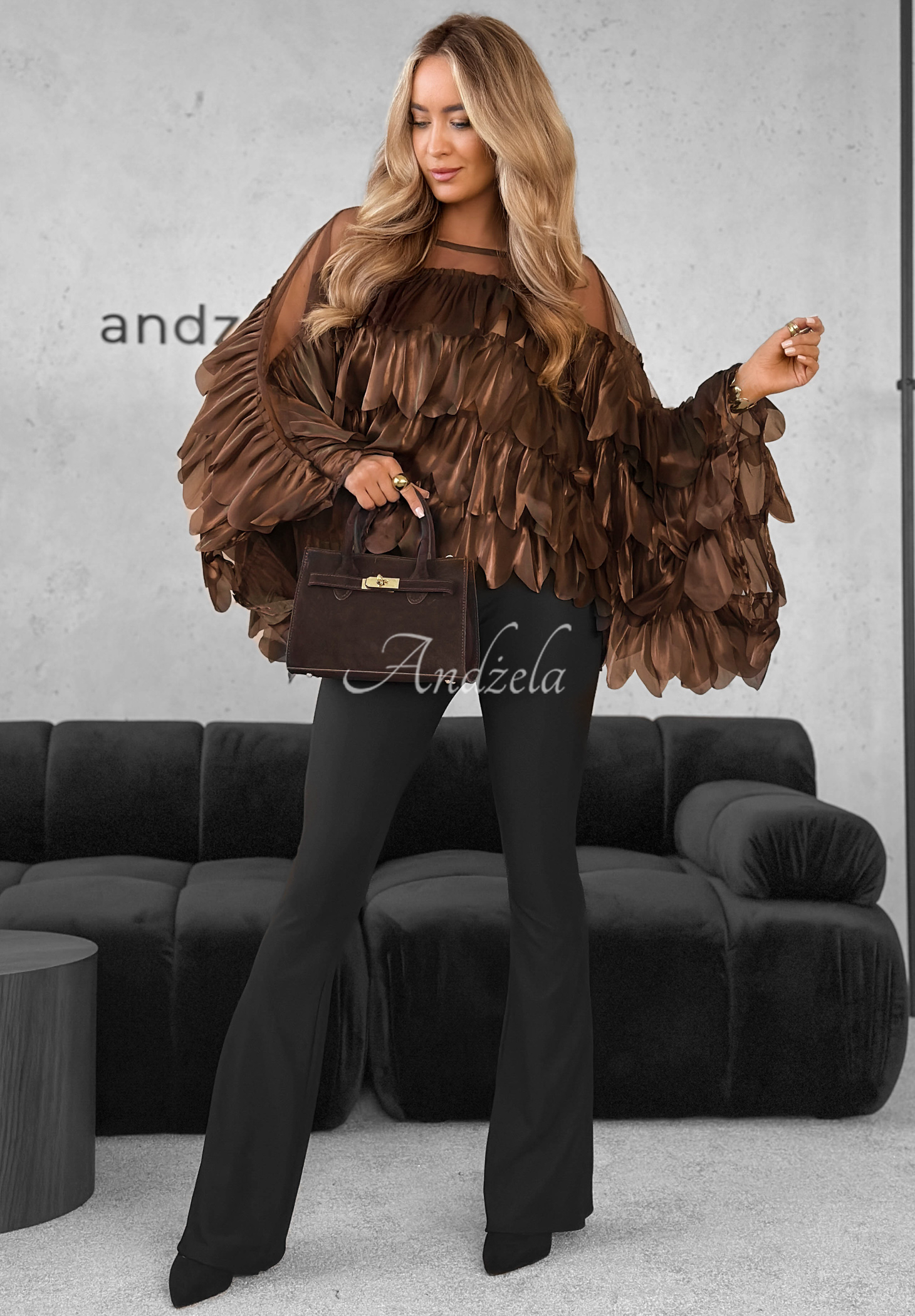 Bluză din viscoză, confecționată din material de tul decorat pe toată suprafața cu volănașe lejere. Model cu croială scurtă, decolteu rotund și mâneci largi.* material neelastic* volănașe* decolteu rotund* mâneci largi* croială scurtă