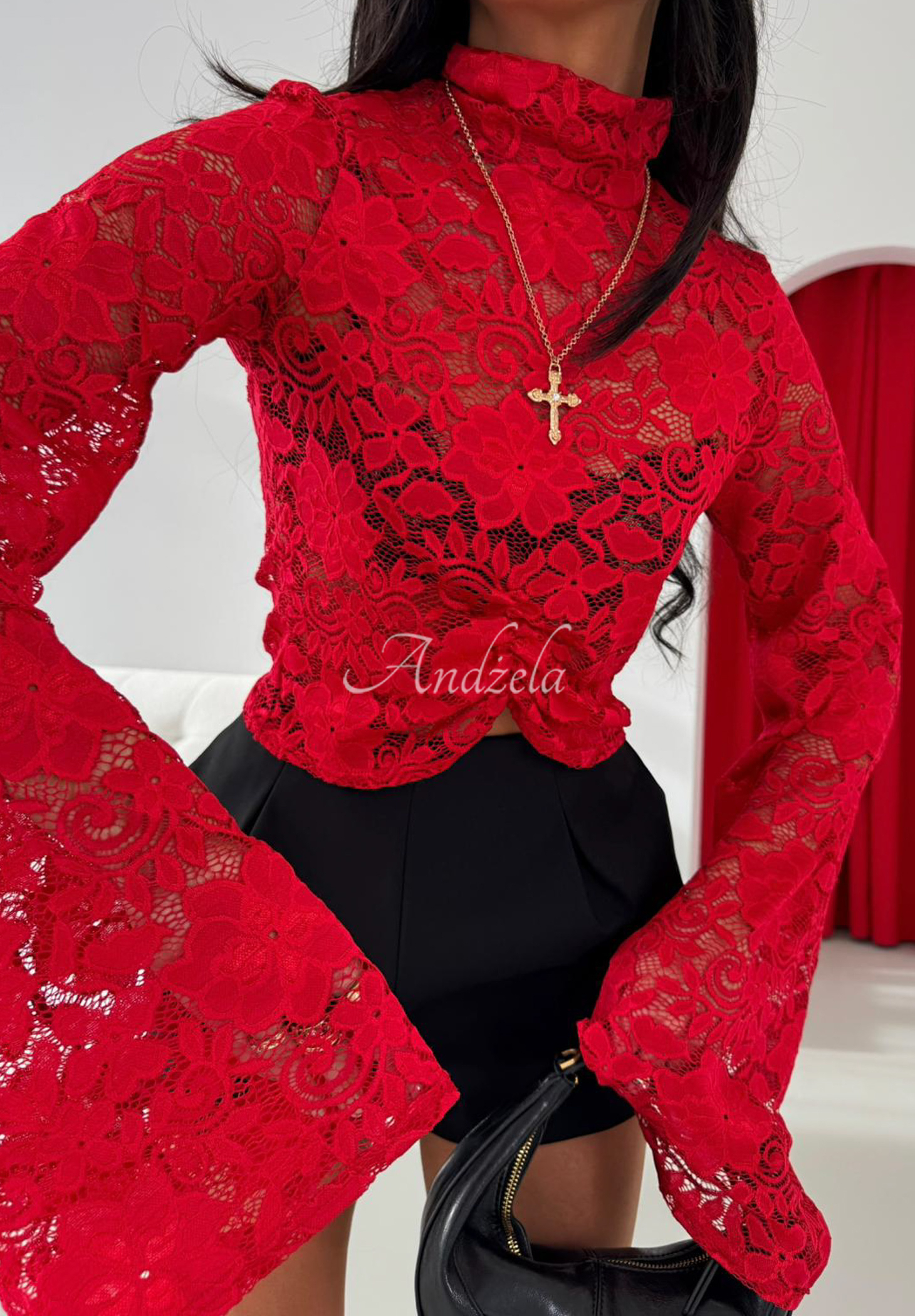 Bluză din dantelă realizată din material transparent pe bază de viscoză. Este un model cu guler și pliuri elegante, având mâneci lungi, lărgite în partea de jos.