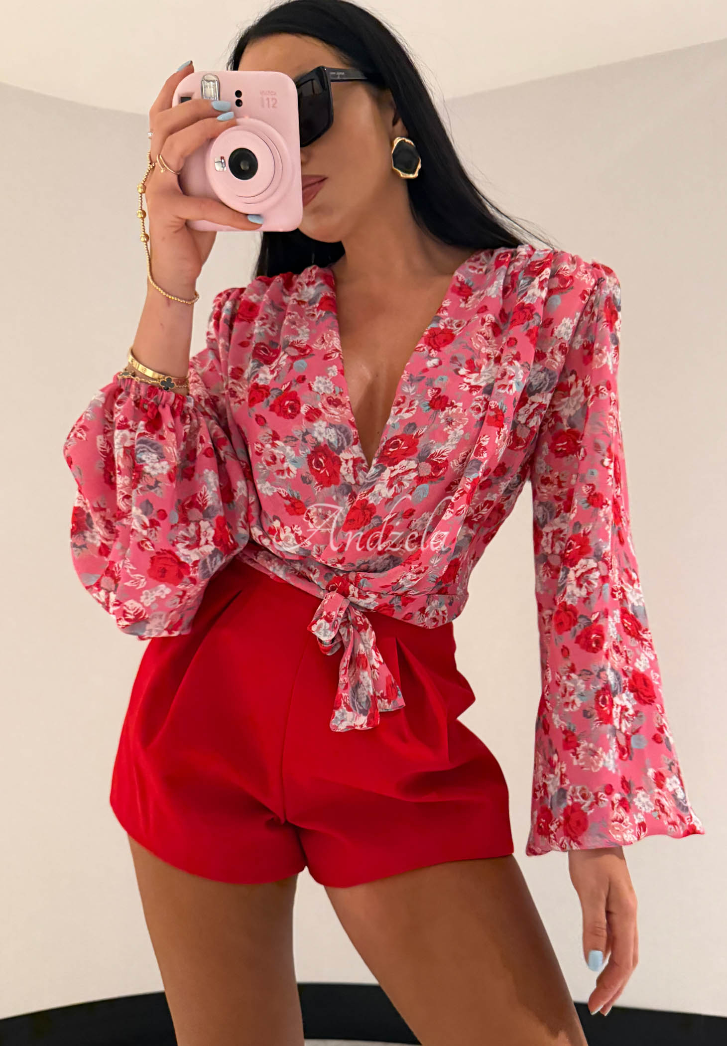 Bluză florală cu croială mai scurtă, confecționată din material de viscoză de înaltă calitate. Model prevăzut cu pernițe pentru umeri, care oferă formă, și cu un sistem de legare decorativ în partea de jos. Mânecile lungi sunt finisate cu elastic.