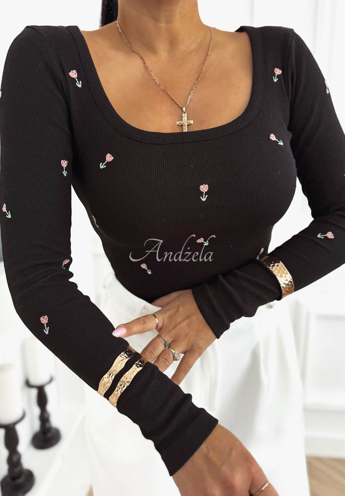 Bluză striată realizată dintr-un material elastic, din bumbac. Este o propunere caracterizată prin flori brodate minimaliste. Are un decolteu mai adânc, rotunjit, și mâneci lungi.