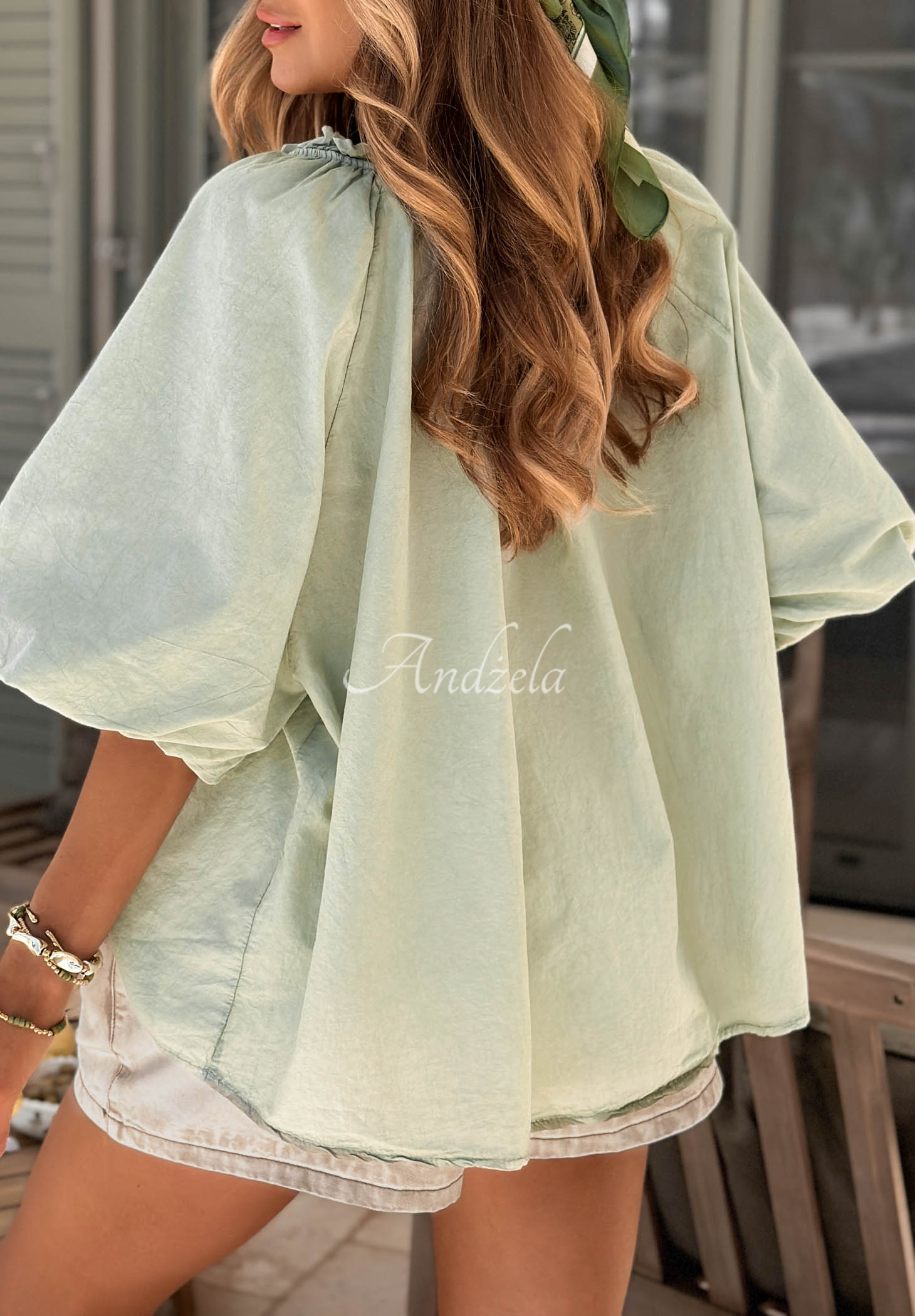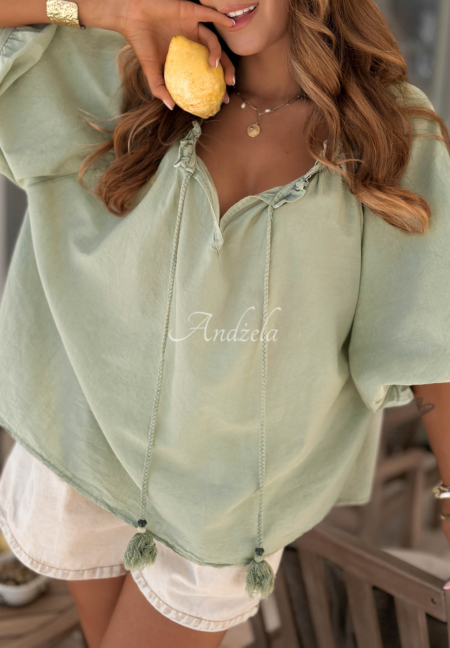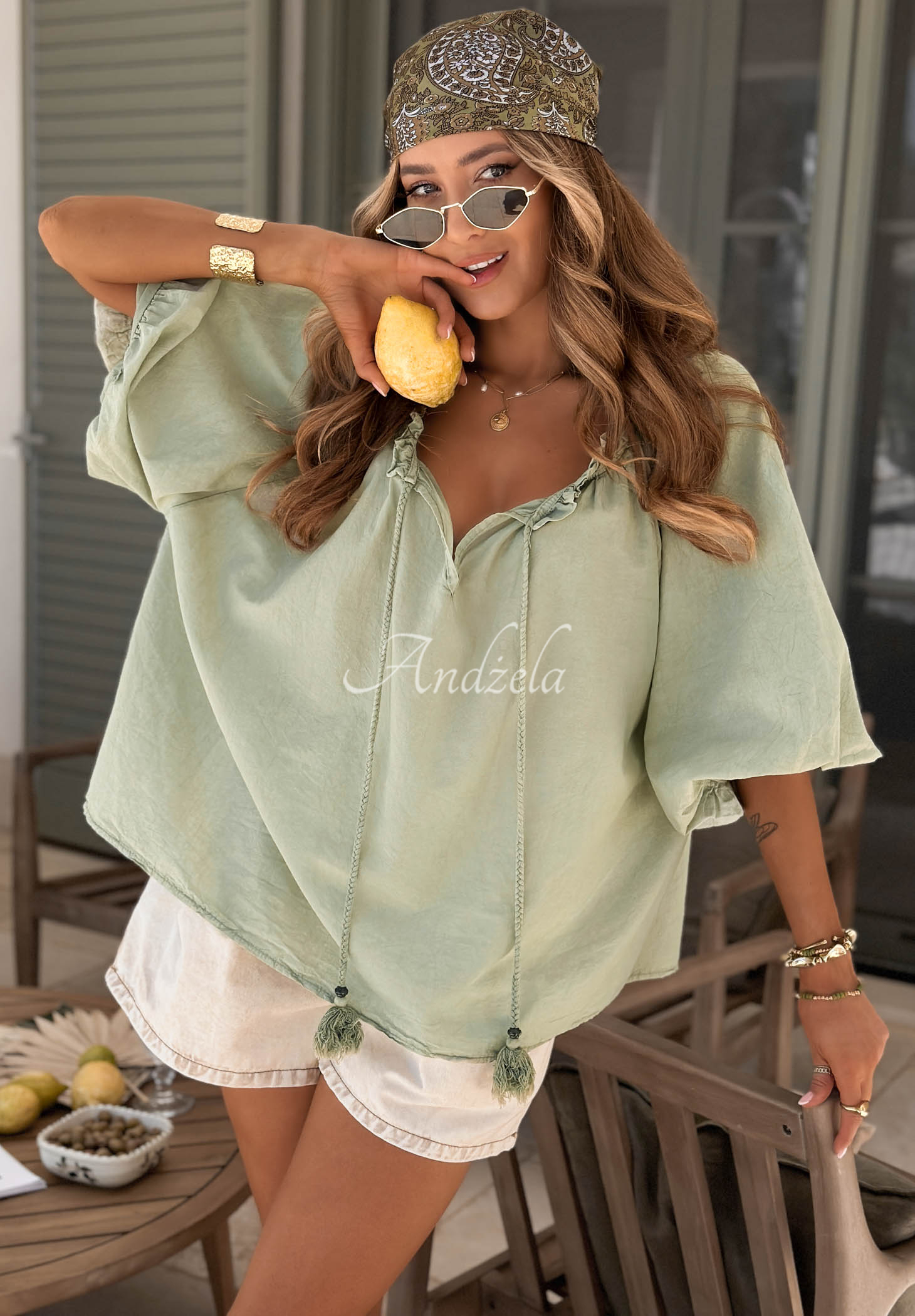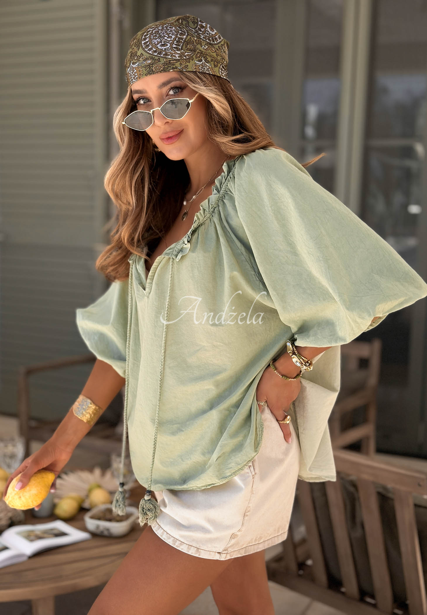 Bluză lejeră realizată din bumbac de înaltă calitate. Se remarcă prin mânecile scurte, bufante. Este un model cu decolteu feminin decupat, decorat cu volănașe fine și legare împletită în față.