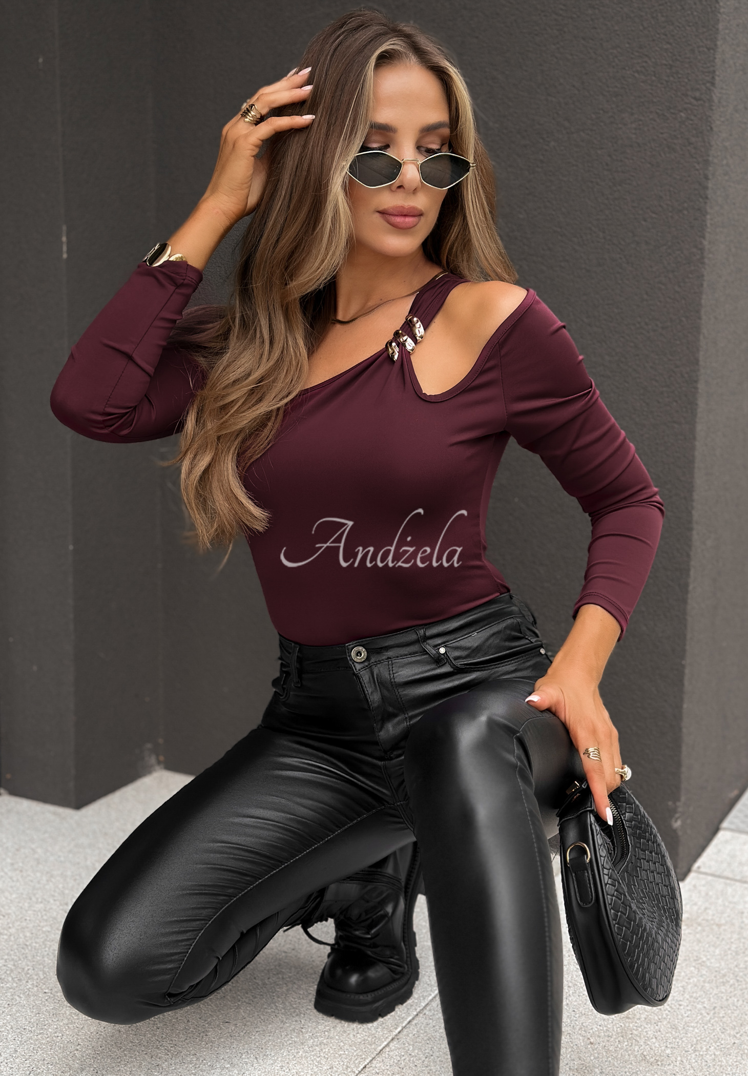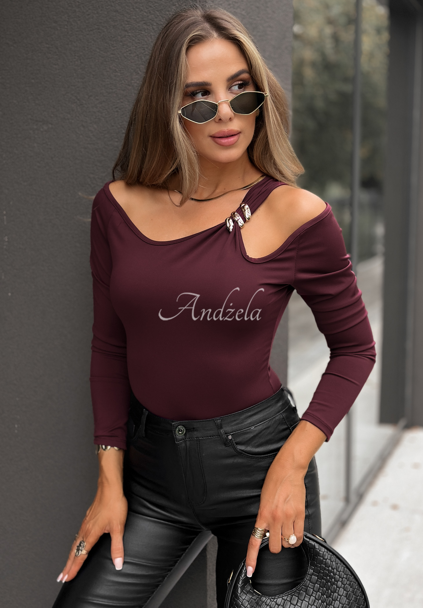 Body cu umerii goi, realizat din material elastic. Se evidențiază prin detaliul auriu și este prevăzut cu închidere reglabilă cu capse.
