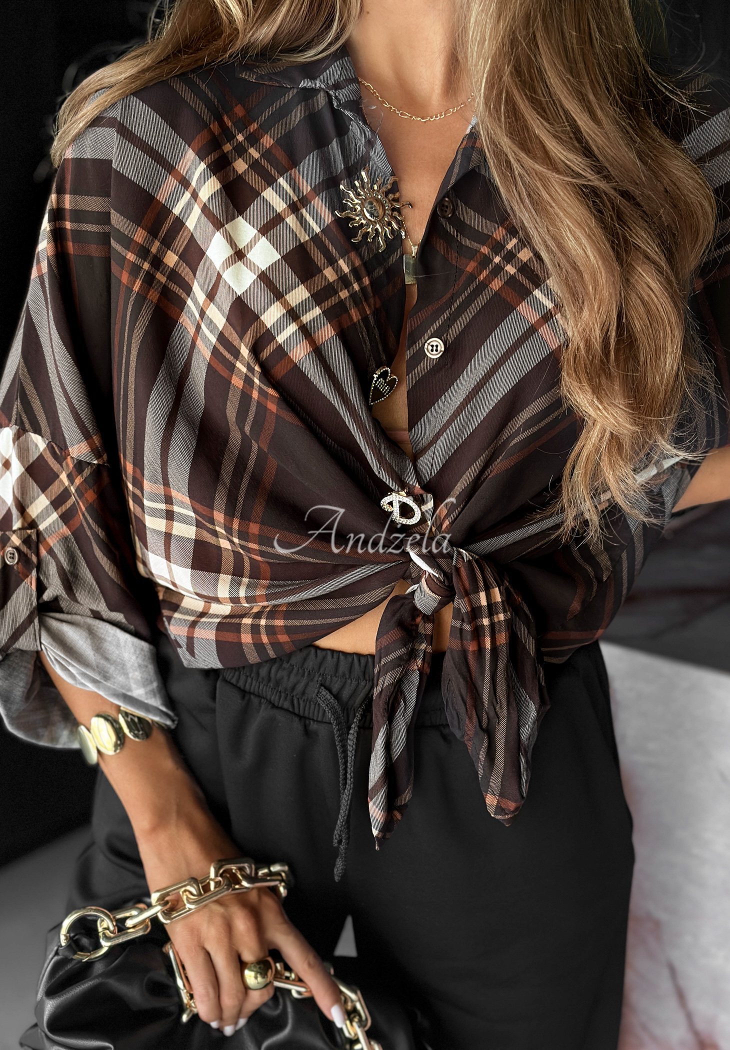 Cămașă clasică în carouri, confecționată din material ușor din viscoză. Model cu guler, se încheie cu nasturi. Are mâneci cu posibilitate de reglare a lungimii. Propunerea se remarcă prin broșele decorative, detașabile.