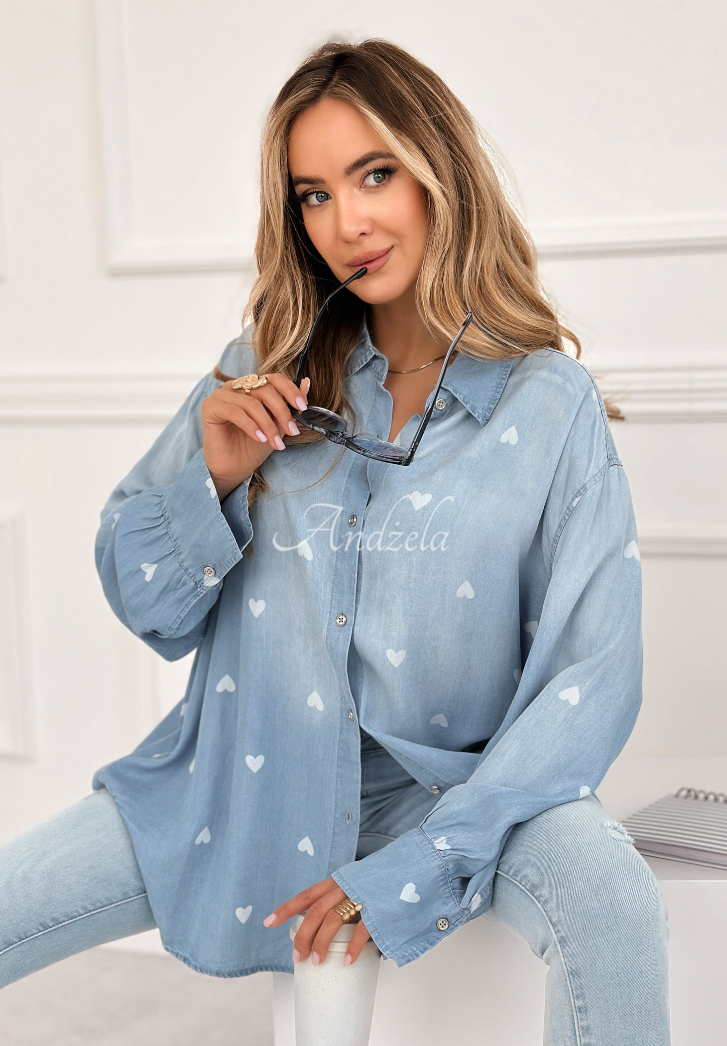 Cămașă din denim realizată din material din bumbac cu adaos de tencel. Este un model asimetric, cu croială clasică, guler și închidere cu nasturi argintii. Mânecile lungi sunt largi și finisate cu manșete. Întregul design se remarcă prin imprimeul cu inimioare.