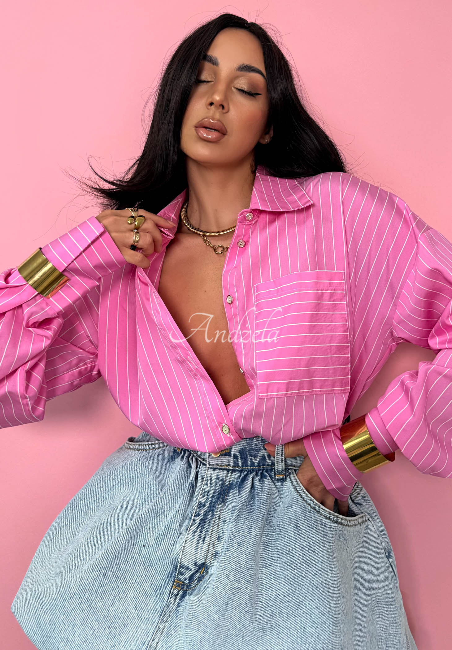 Cămașă oversize cu dungi, confecționată din țesătură de bumbac. Model cu guler, prevăzut cu un buzunar la nivelul bustului. Se închide cu un șir de nasturi aurii, iar mânecile sunt finisate cu manșete.