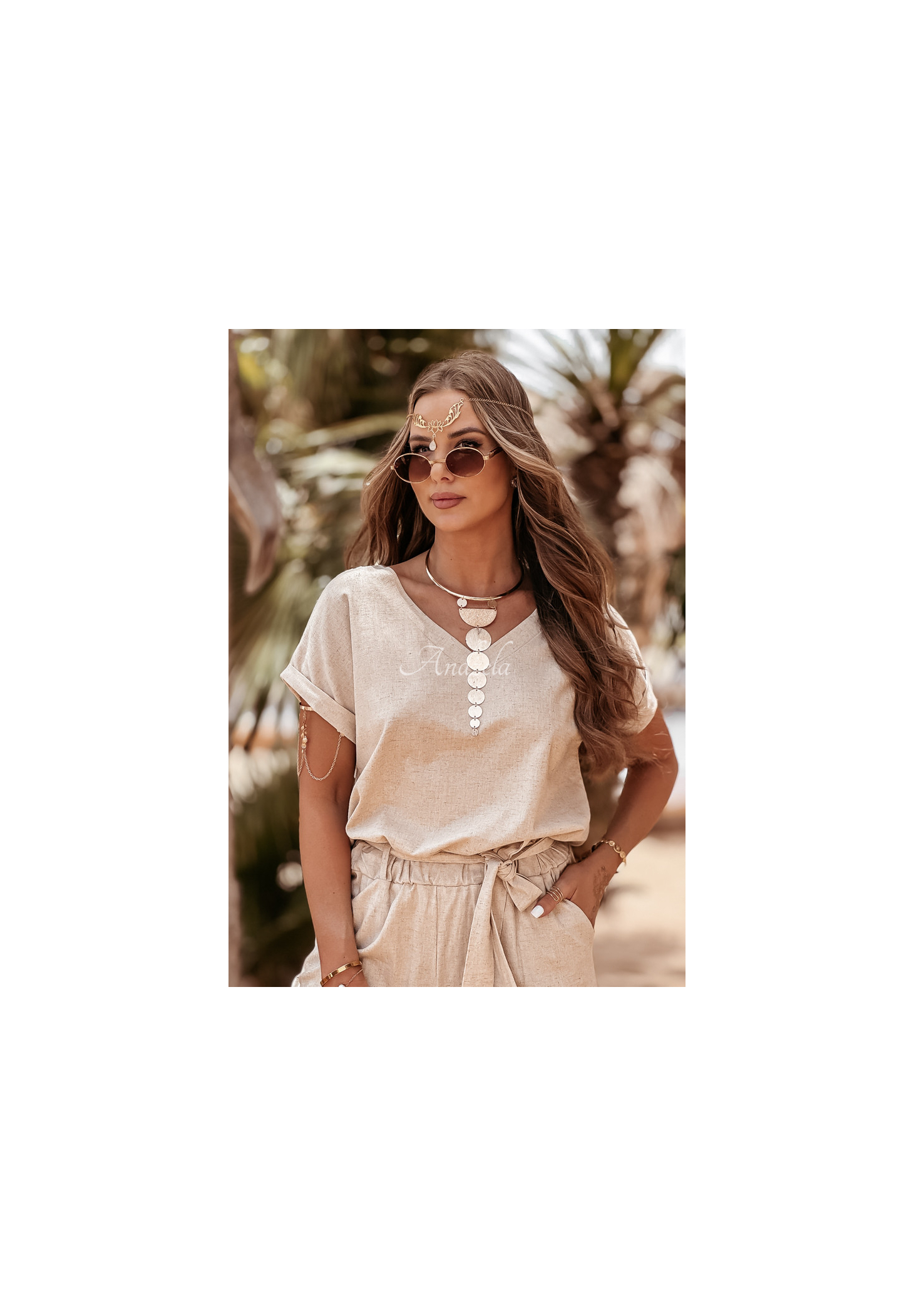 Compleu din material de înaltă calitate care combină inul și viscoza este un must-have în orice garderobă de vară. Tricoul are o croială clasică, un decolteu feminin în forma literei V și mâneci suflecate permanent. Pantalonii au craci conici sunt un model cu buzunare funcționale și o bandă elastică la talie, datorită căreia se potrivesc perfect silueta. Setul include și o curea care va completa perfect orice look. Acest compleu este o opțiune care vă permite să creați multe ținute pentru zilele caniculare.