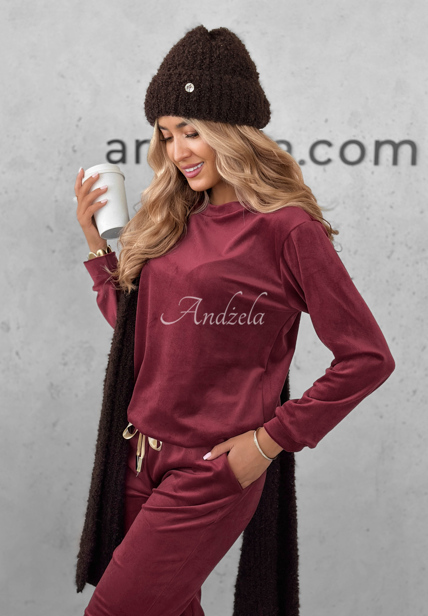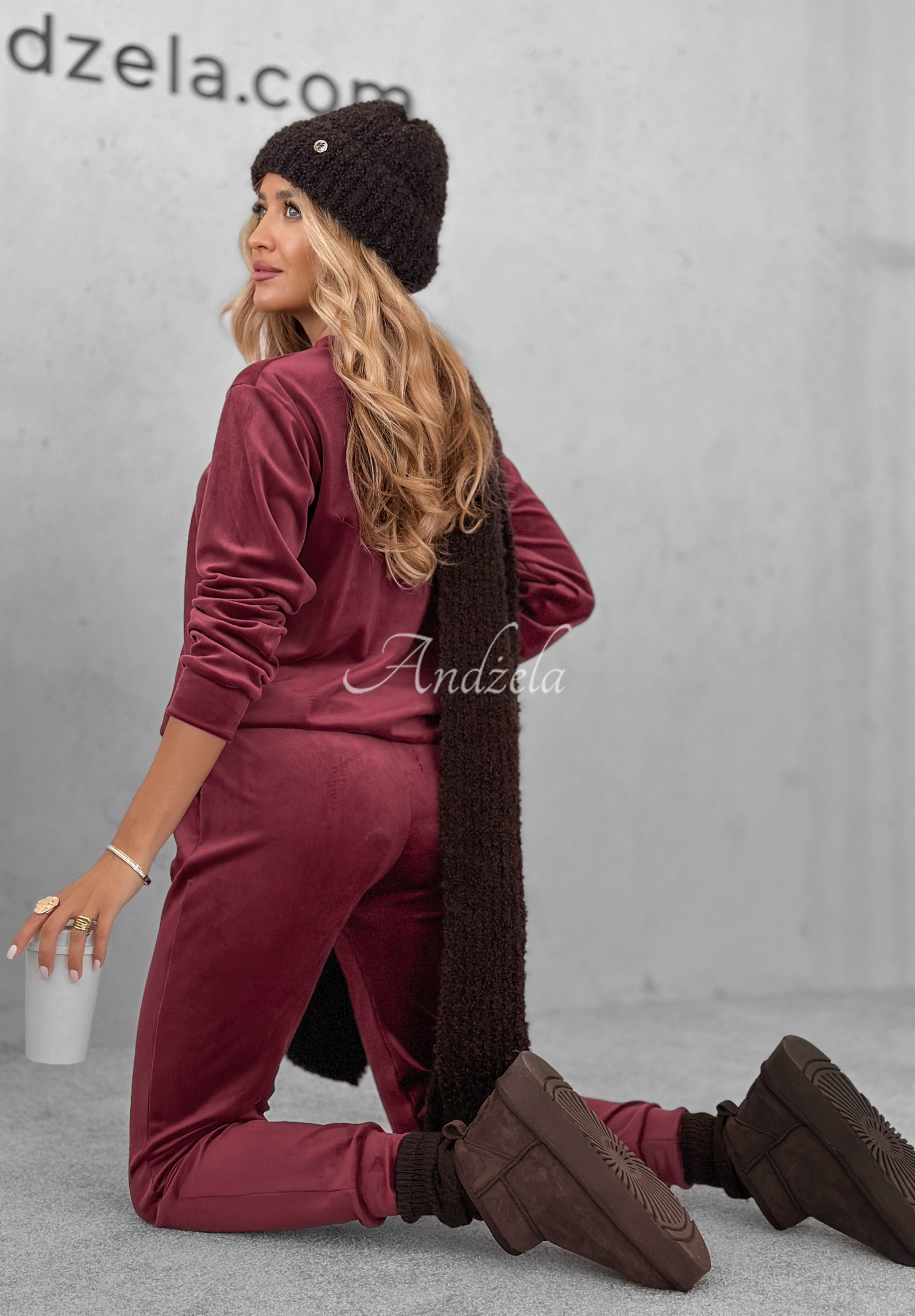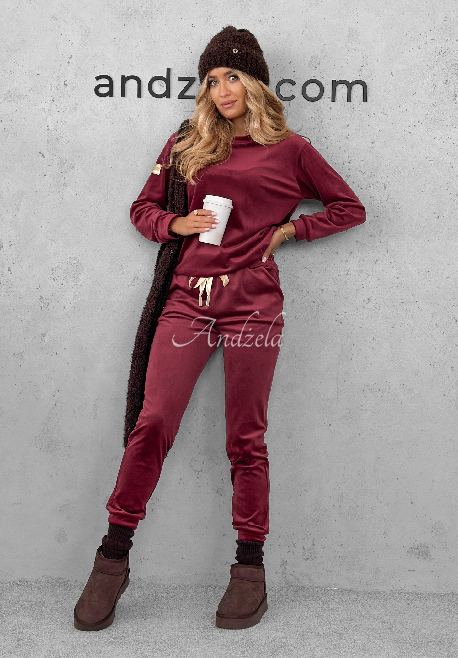 Set din velur realizat dintr-un material neted, plăcut la atingere. Bluza are croială cu decolteu rotund și mâneci lungi, terminate cu manșete elastice, la fel ca partea de jos. Pe una dintre mâneci se află o aplicație decorativă. Pantalonii au talie medie, cu elastic în talie și două buzunare funcționale.