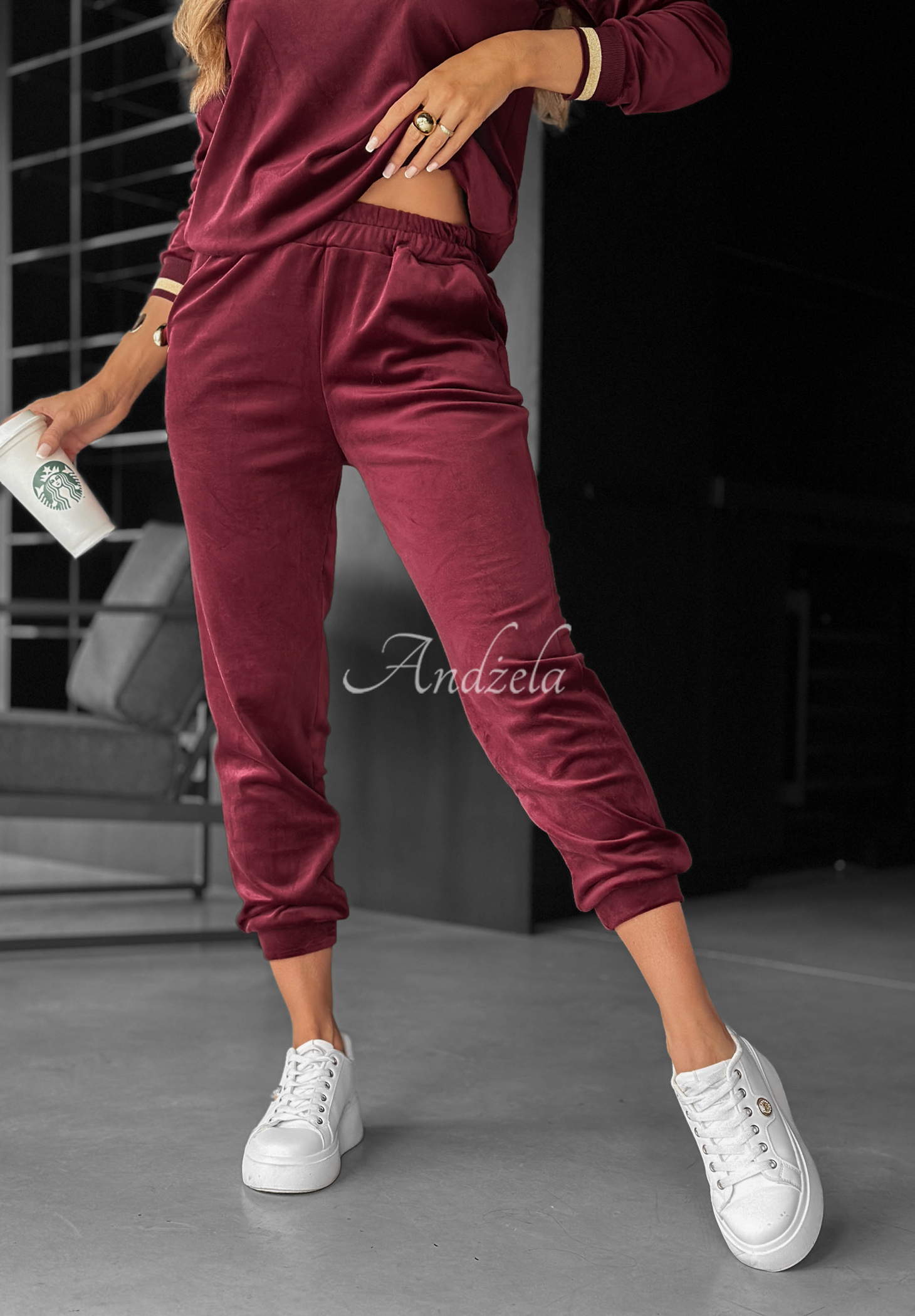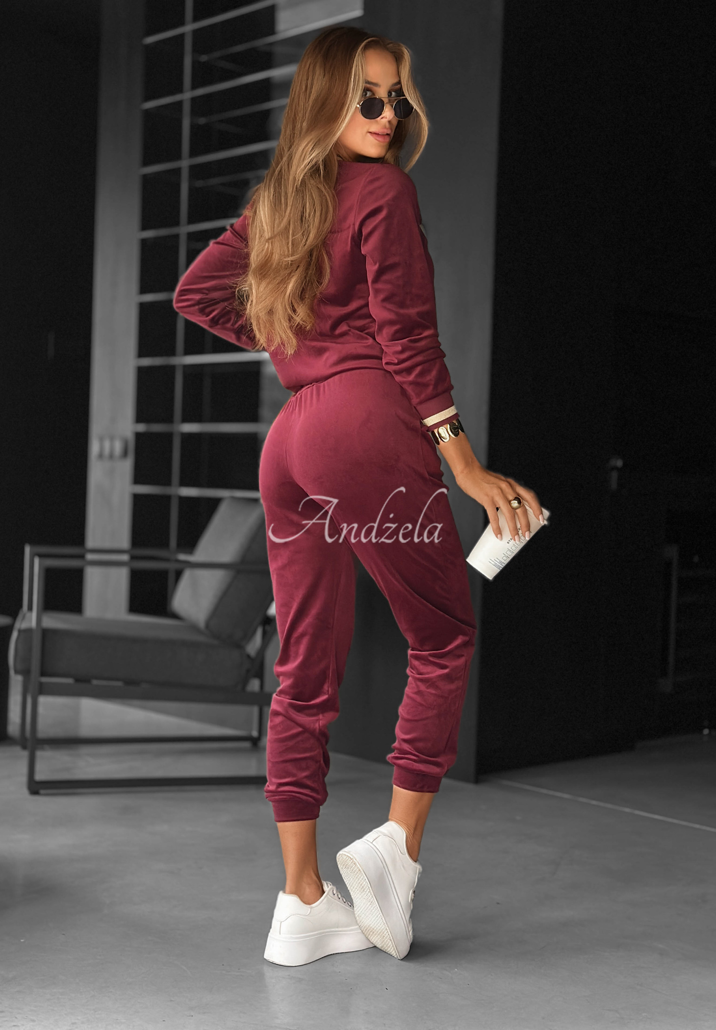 Setul de trening din velur este o propunere creată pentru ținutele de zi cu zi. Hanoracul cu decolteu în V are mâneci lungi terminate cu manșete. Pantalonii sunt un model cu talie elastică și buzunare funcționale în față.