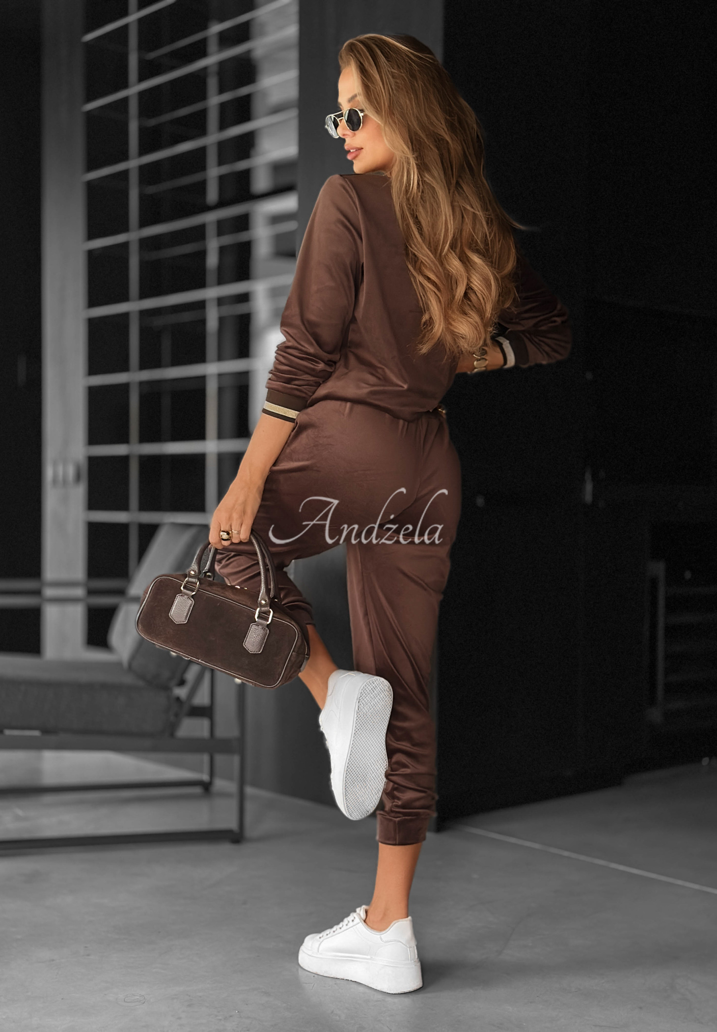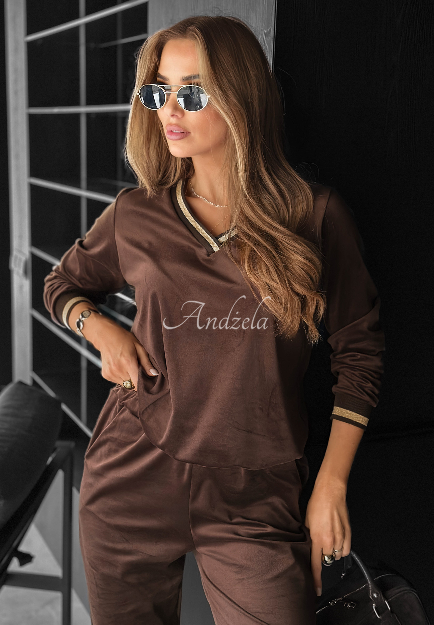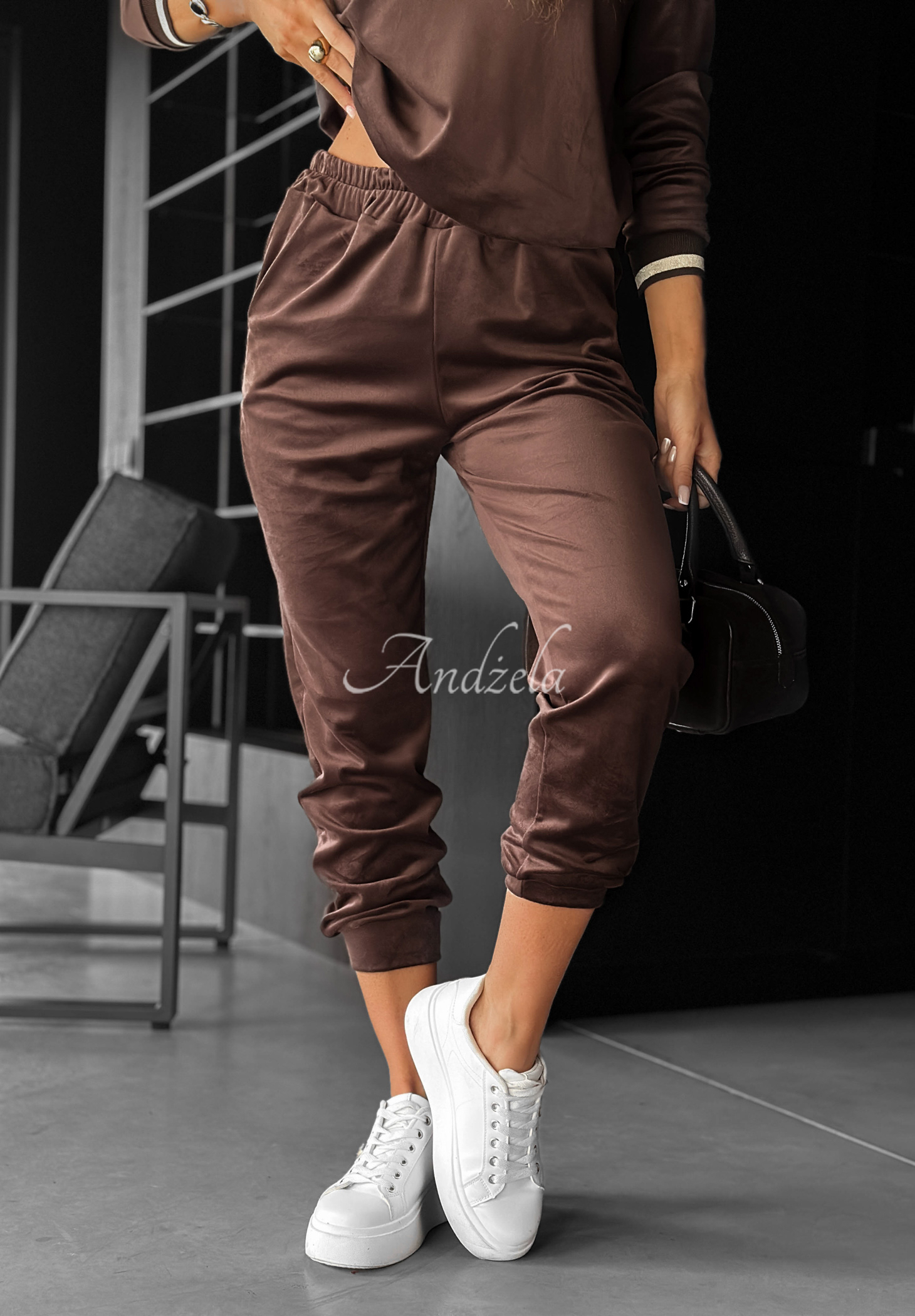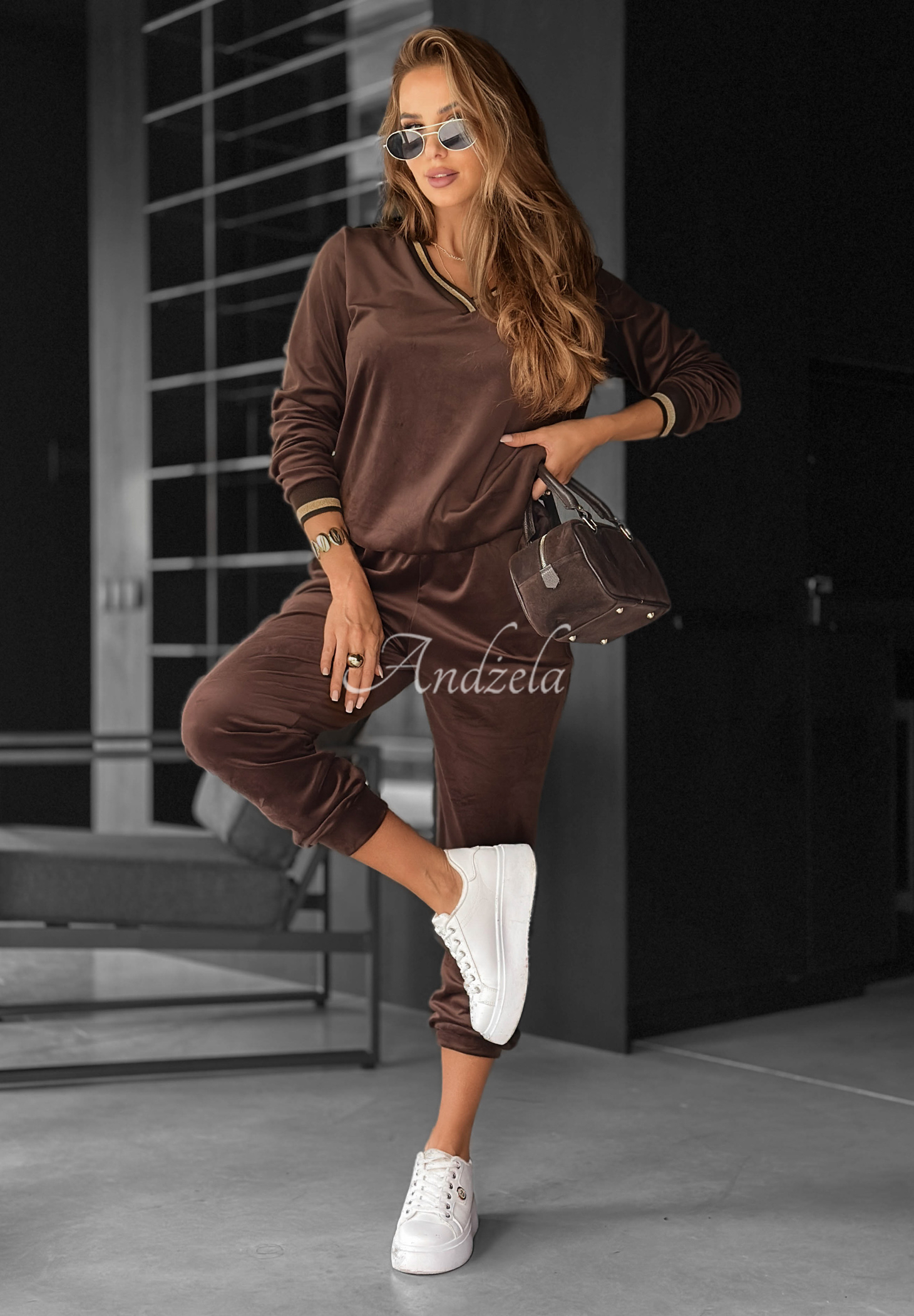 Setul de trening din velur este o propunere creată pentru ținutele de zi cu zi. Hanoracul cu decolteu în V are mâneci lungi terminate cu manșete. Pantalonii sunt un model cu talie elastică și buzunare funcționale în față.
