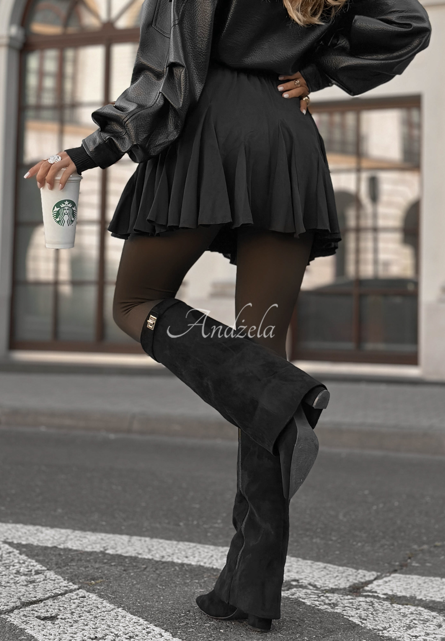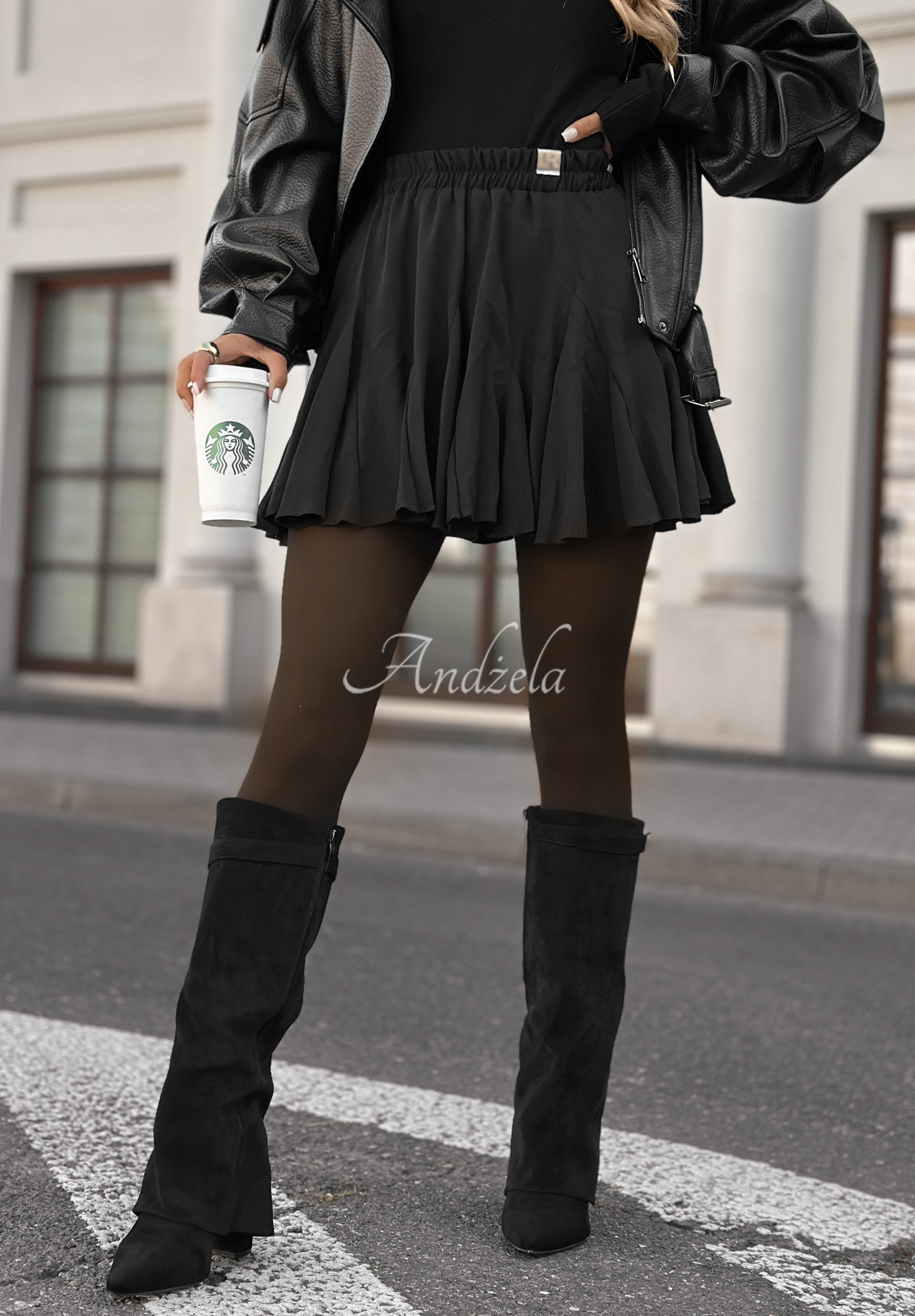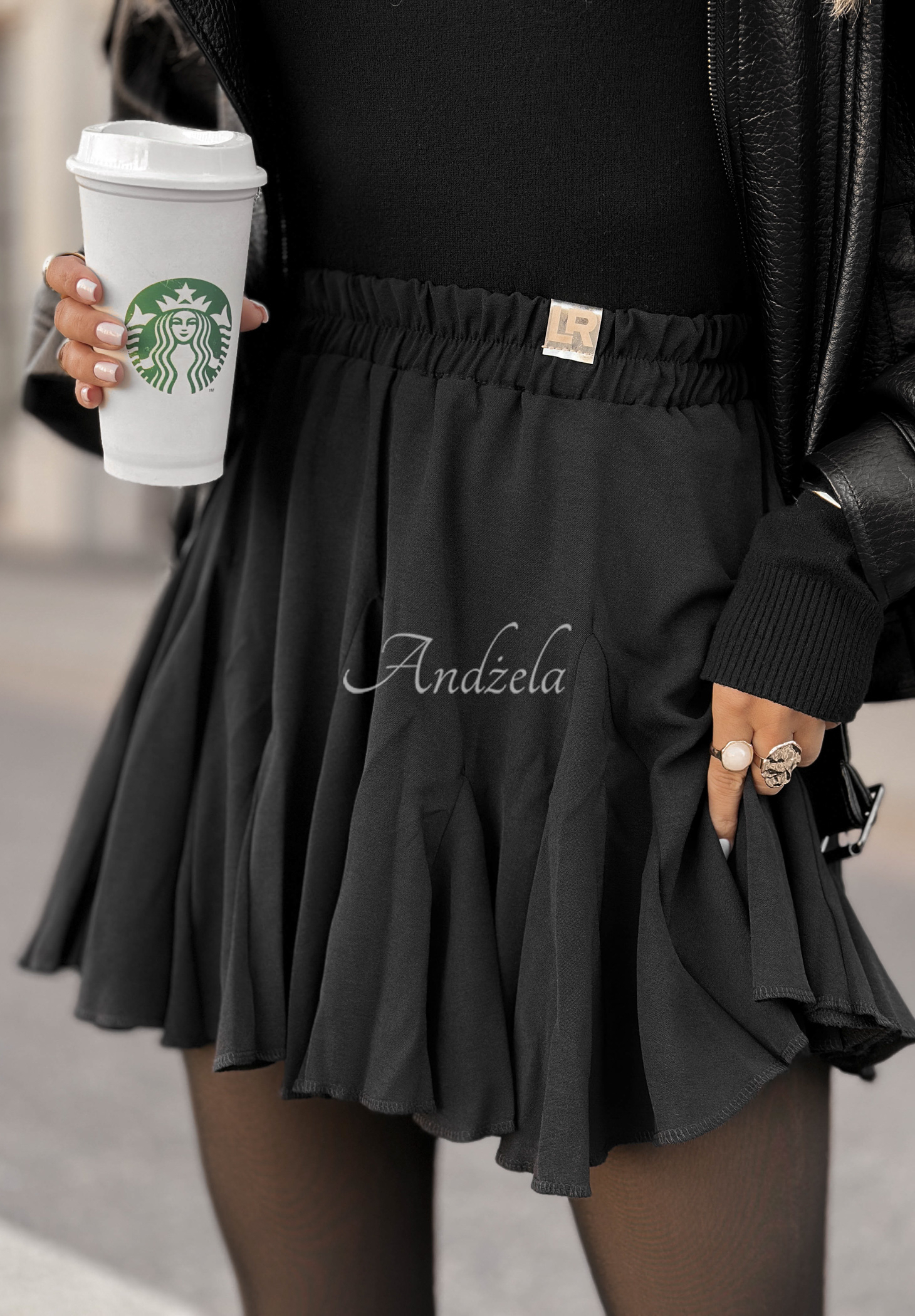 Fustă lejeră cu croială evazată, confecționată din material ușor. Este un model mini, cu elastic în talie. În față are o mică aplicație.