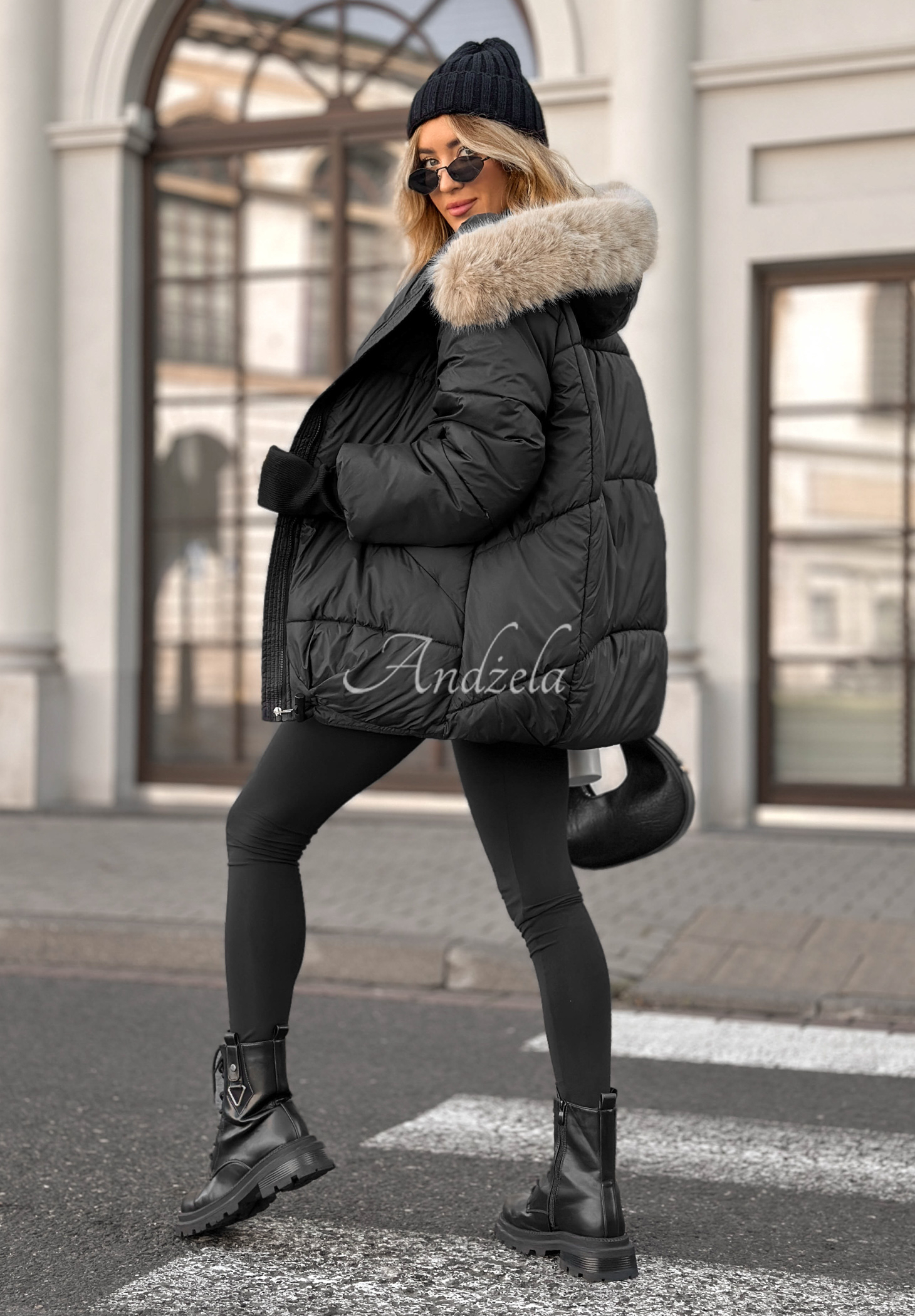 Geacă matlasată, căptușită cu puf sintetic. Model cu glugă și blană sintetică detașabilă, prevăzut cu buzunare funcționale. Mâneci lungi terminate cu manșete tricotate.