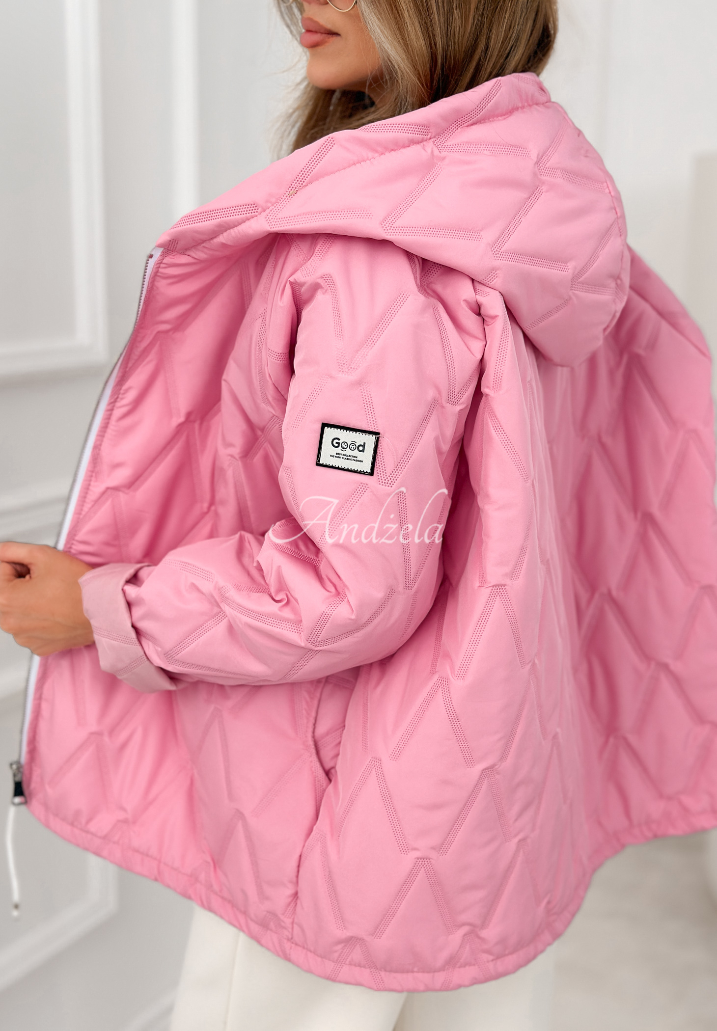 Geacă lejeră cu căptușeală sintetică ușoară. Este un model cu croială scurtă, cu glugă și șnur reglabil integrat în partea de jos. Are mâneci lungi, precum și buzunare funcționale în partea din față. Întregul design este matlasat și prevăzut cu închidere cu fermoar argintiu.