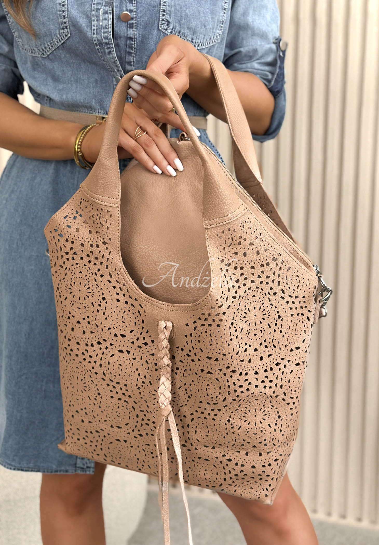 Geantă ajurată realizată din piele ecologică moale. Este un model cu un singur compartiment, cu închidere cu fermoar. În set este inclusă o husă funcțională împreună cu o curea. Se închide cu fermoar, fiind prevăzută cu buzunare suplimentare. Poate fi folosită ca organizer sau ca geantă separată.
