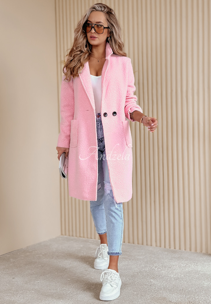 Un pardesiu din imitație de lână de miel este o propunere creată pentru sezonul de tranziție. Un model cu croială lungă, guler și mâneci lungi. Se închide cu doi nasturi și are buzunare funcționale în față.