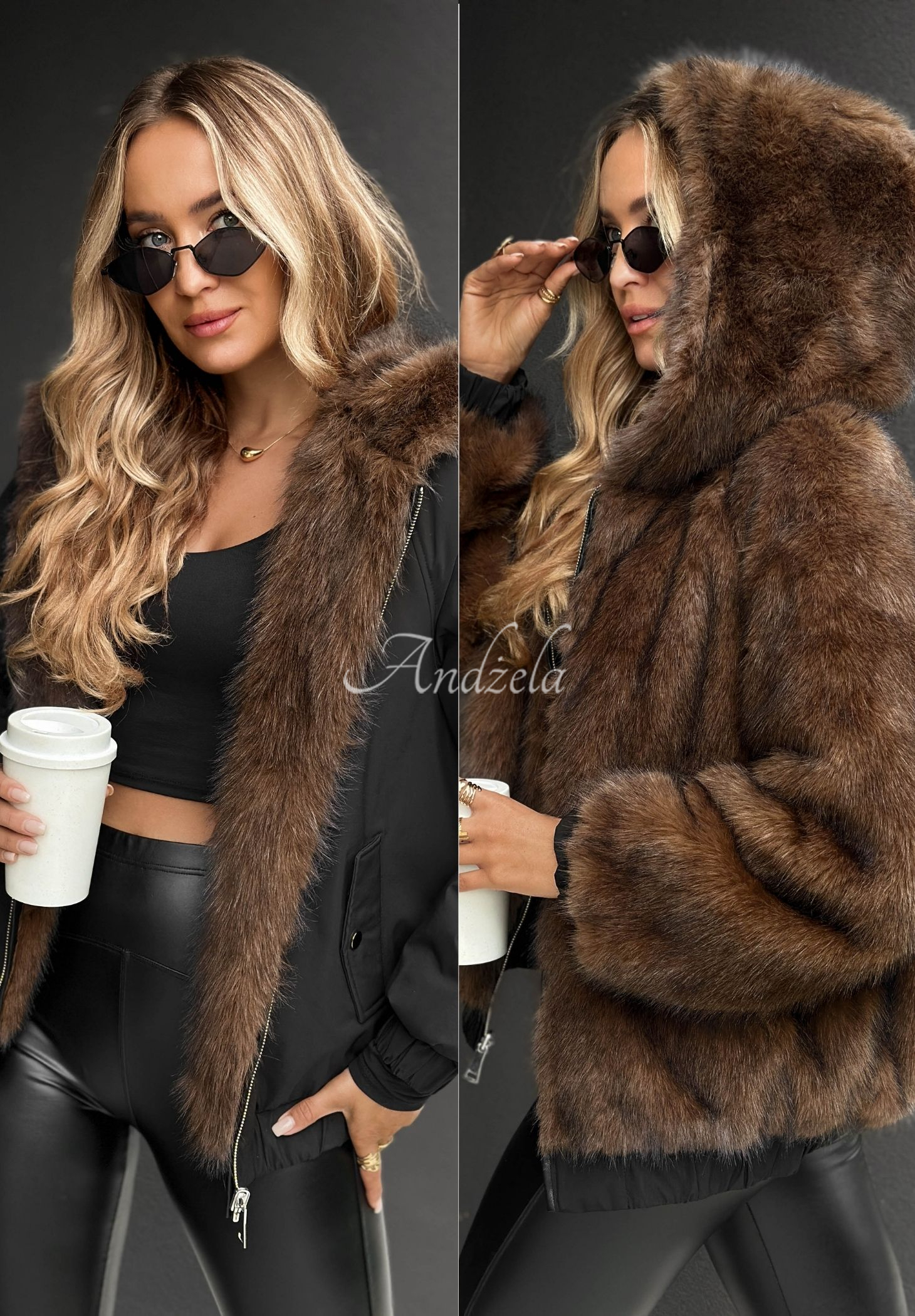 Geacă reversibilă cu umplutură sintetică, ce permite purtarea în diverse stiluri. Pe o parte este netedă, din material textil, iar pe cealaltă este finisată cu blăniță moale și plăcută la atingere. Model cu glugă și închidere cu fermoar argintiu. Dispune de buzunare funcționale pe ambele părți și de bandă elastică în partea de jos.