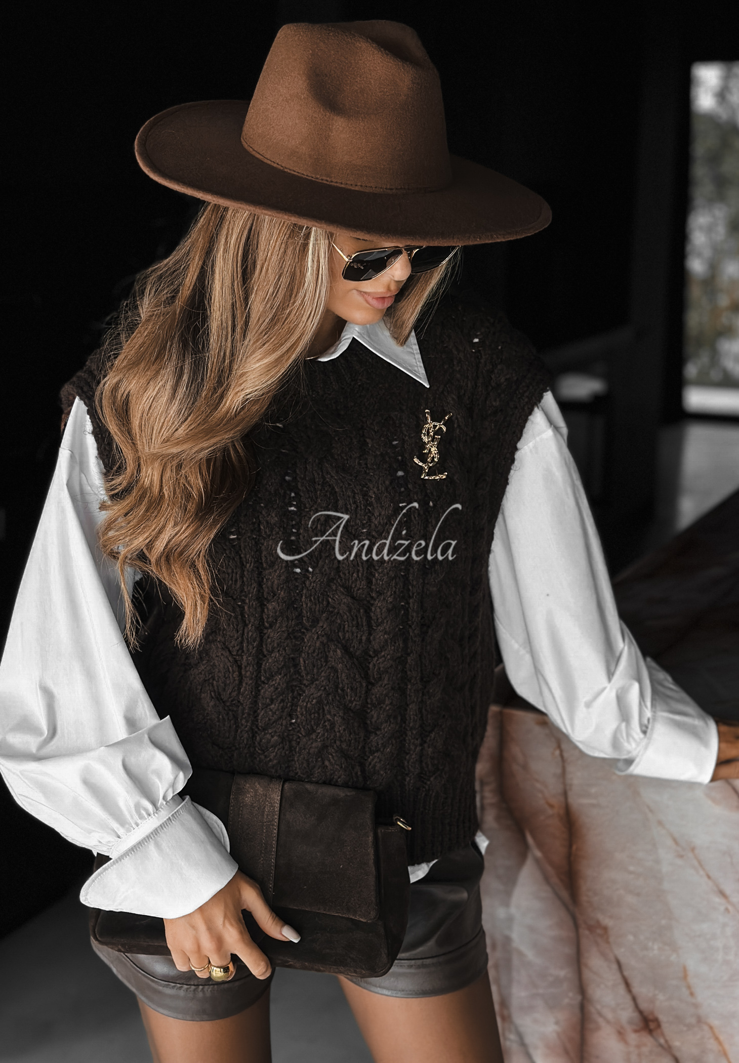 Vestă realizată din materiale de înaltă calitate, cu adaos de lână, alpaca și viscoză. Model tricotat cu împletitură decorativă, prevăzut cu bandă elastică în partea de jos.* material elastic* decolteu rotunjit* bandă elastică în partea de jos
