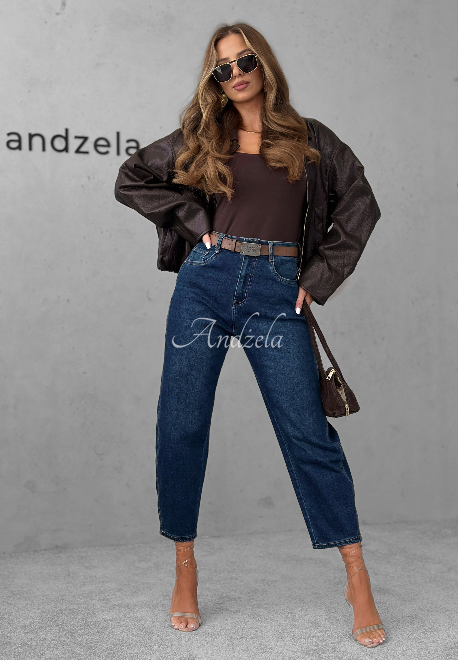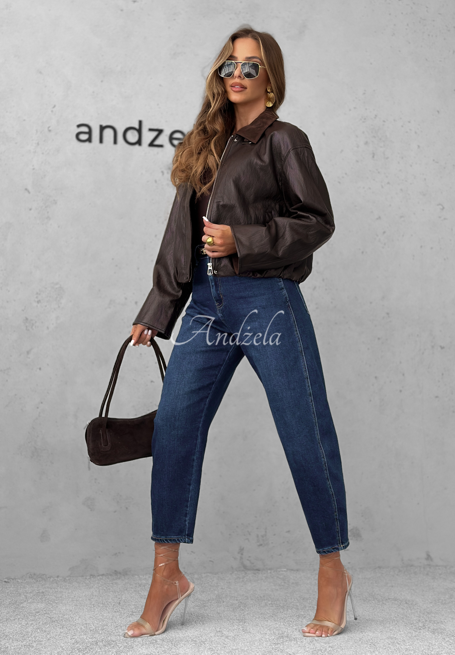 Geacă bomber din imitație de piele, cu croială scurtă. Model cu guler textil, croială oversize și buzunare funcționale în față. Are elastic în partea de jos și se închide cu fermoar și capse.