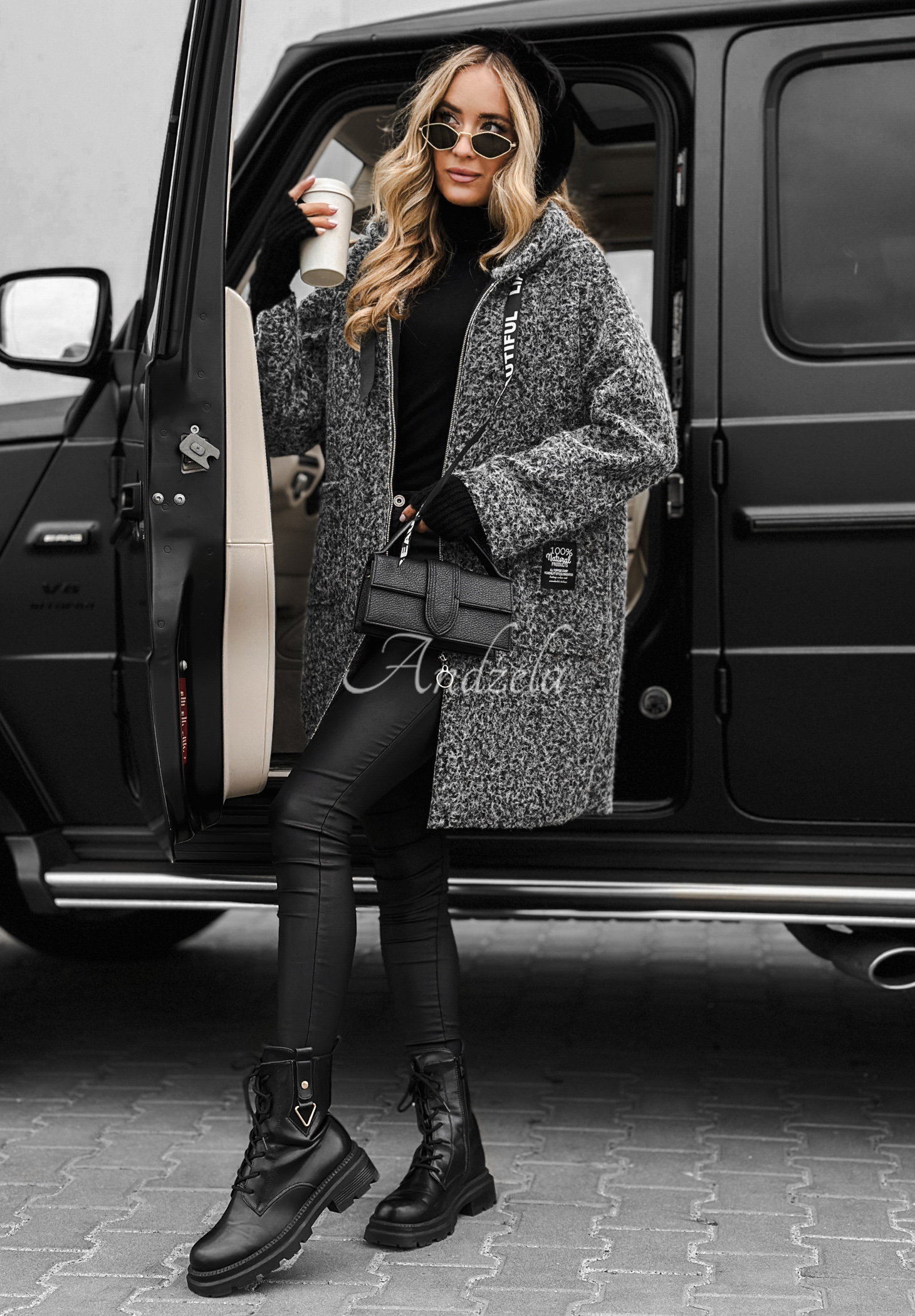 Pardesiu din imitație de lână de miel, cu croială lungă și adaos de lână. Model cu glugă, care se remarcă prin finisaje brute și buzunare funcționale decorate cu o aplicație.