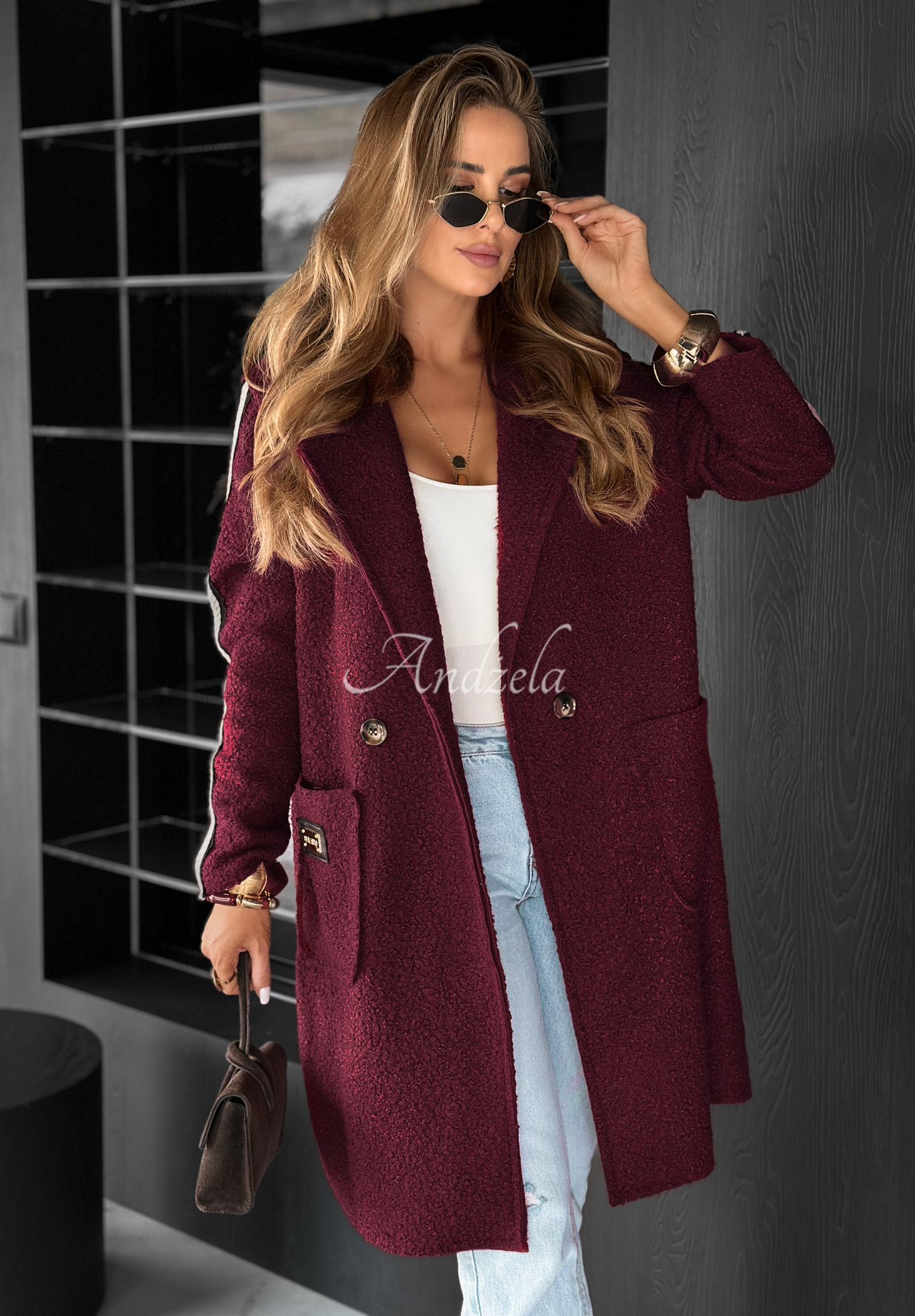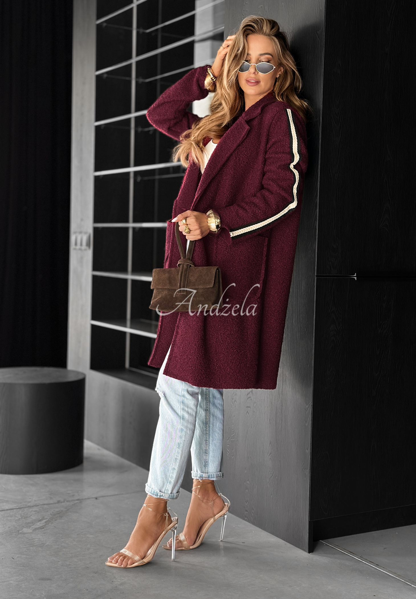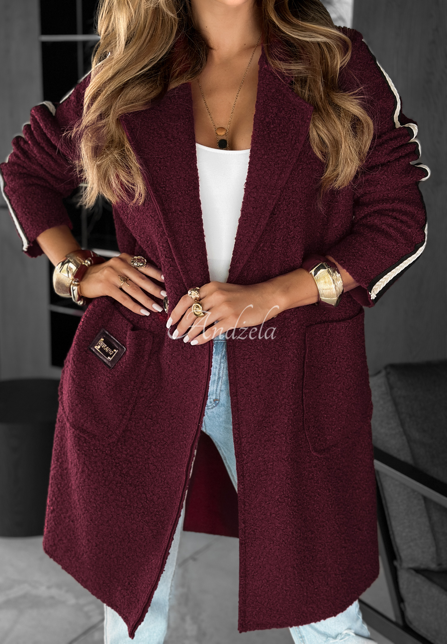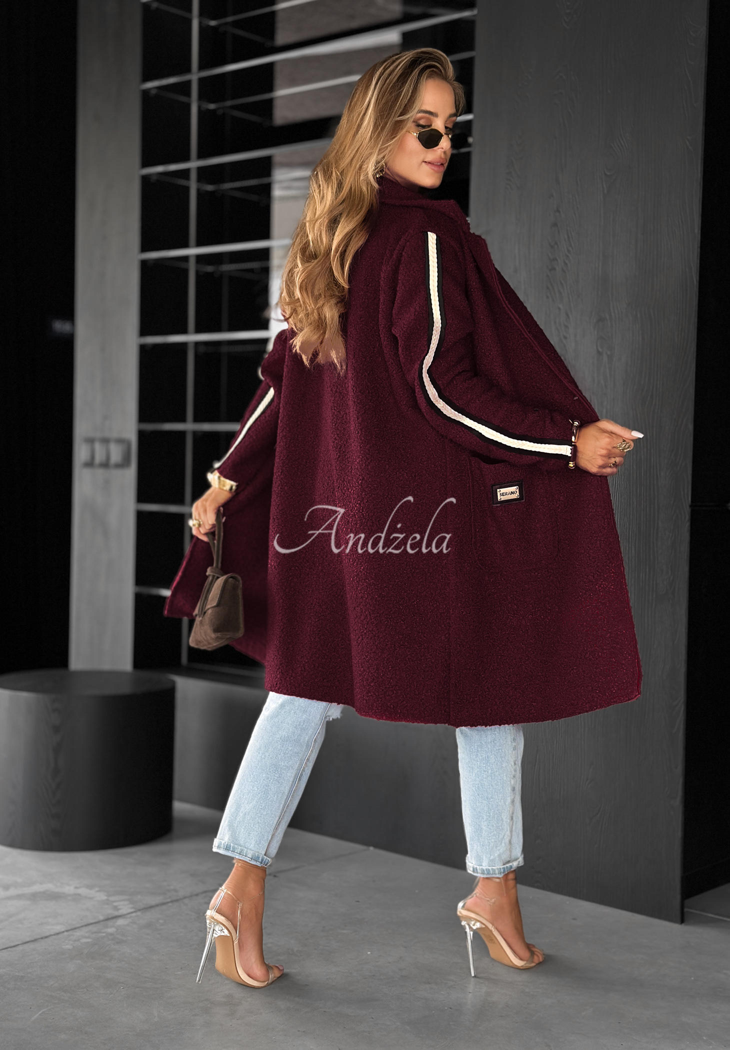 Pardesiu lejer confecționat dintr-un material plăcut, asemănător lânii de miel. Model cu guler și închidere cu un nasture. Se remarcă prin mânecile lungi decorate cu dungă laterală. În partea din față are buzunare funcționale. Ținuta este completată de o broșă argintie inclusă în set.