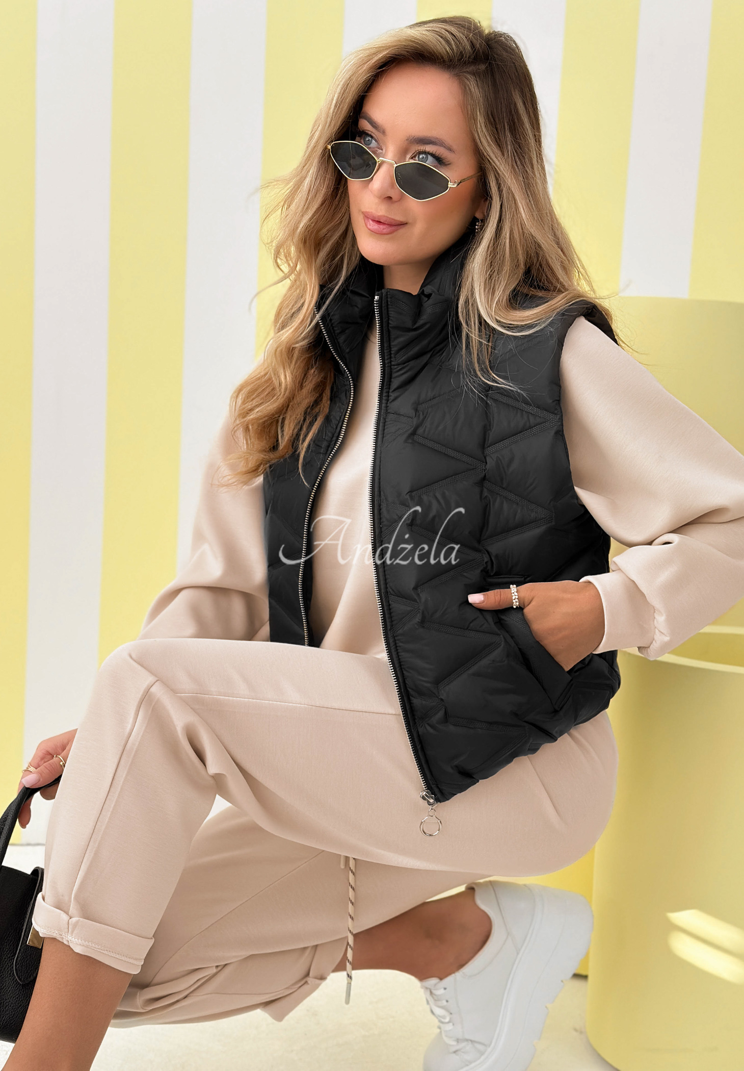 Vesta scurtă matlasată este o propunere cu guler ridicat. Modelul se închide cu fermoar și are buzunare funcționale.