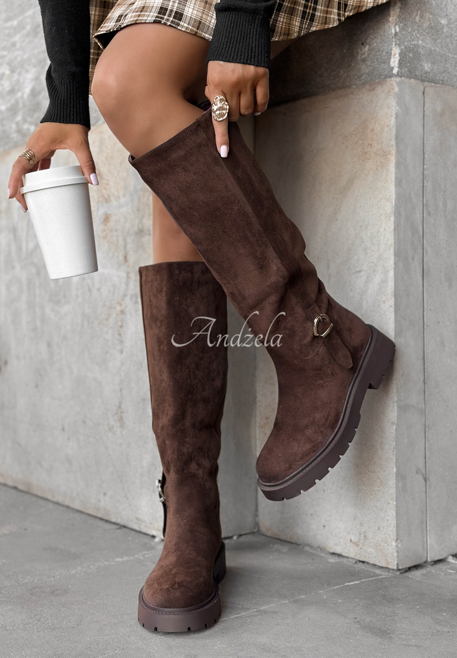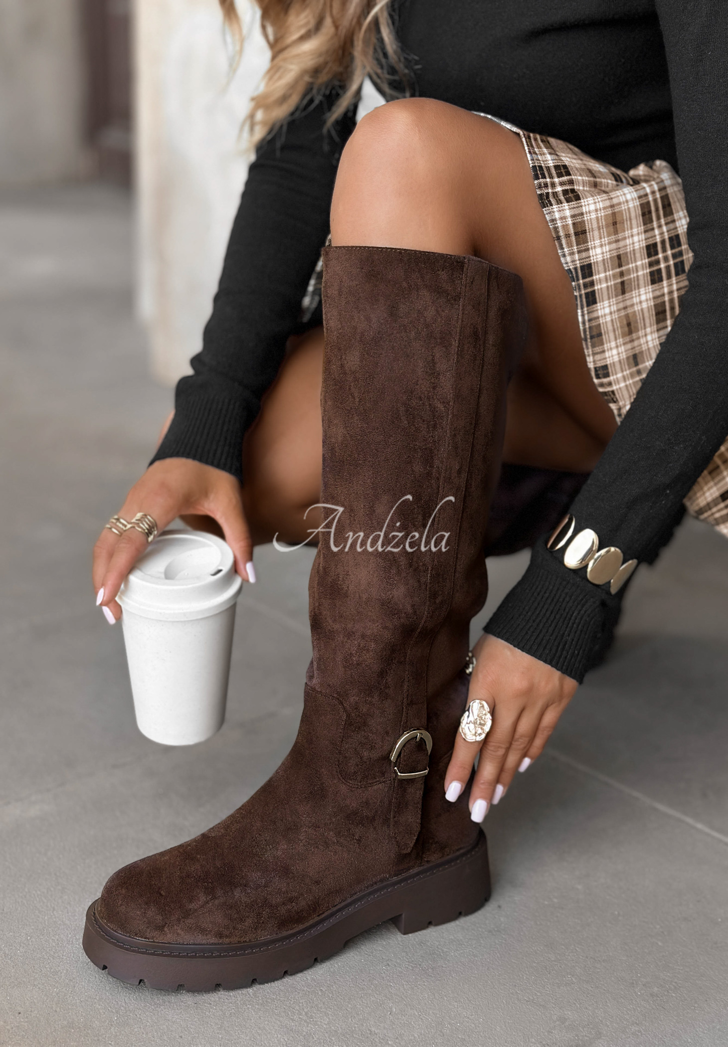 Cizme lungi, ușor călduroase, confecționate din imitație de piele întoarsă. Modelul are închidere cu fermoar pe partea interioară, vârf ușor rotunjit și un detaliu decorativ argintiu.