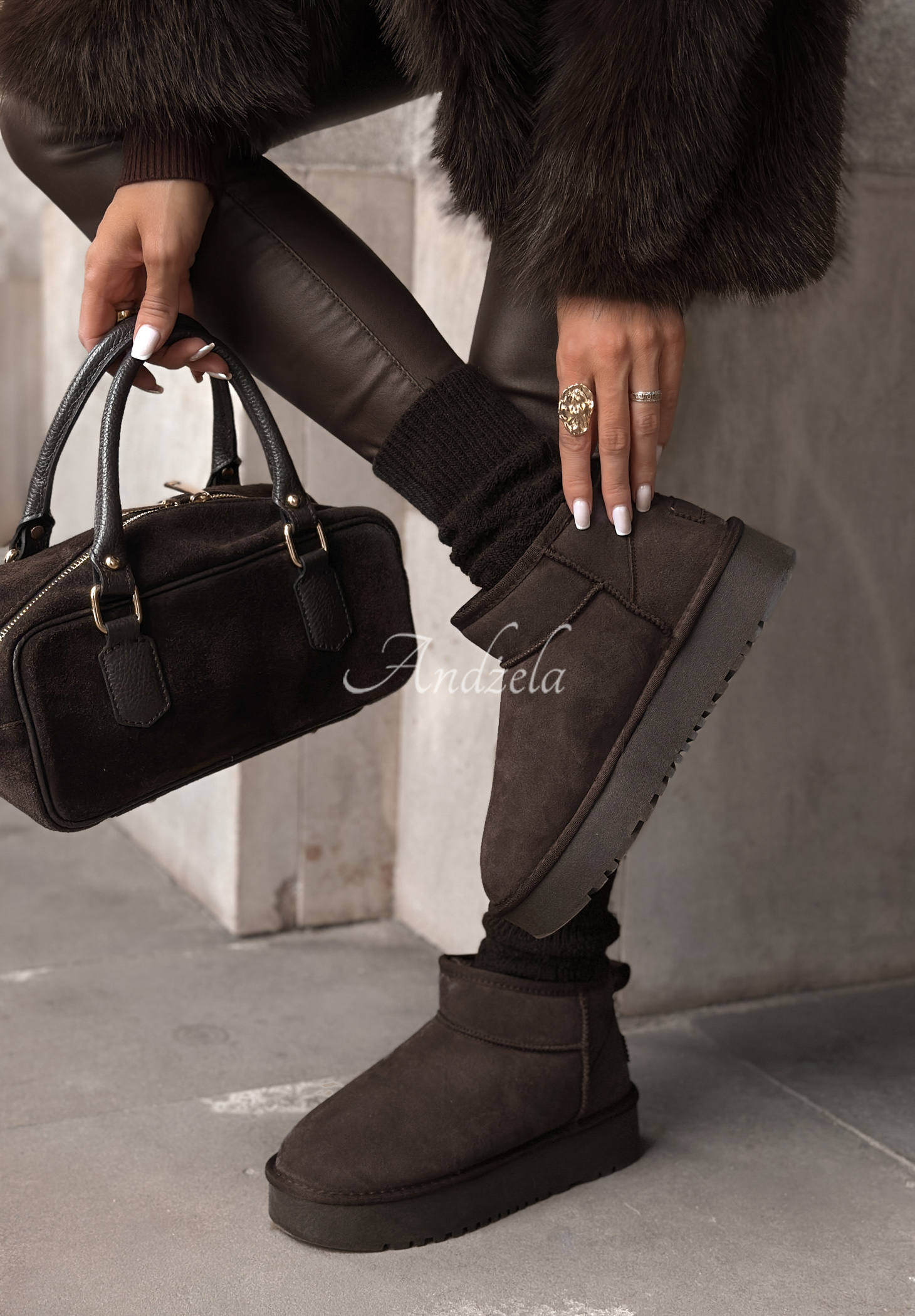 Botine confortabile, confecționate din piele întoarsă naturală. Model cu căptușeală moale din blăniță teddy. Sunt așezate pe o talpă plată, ușor înălțată, și au vârf rotunjit.