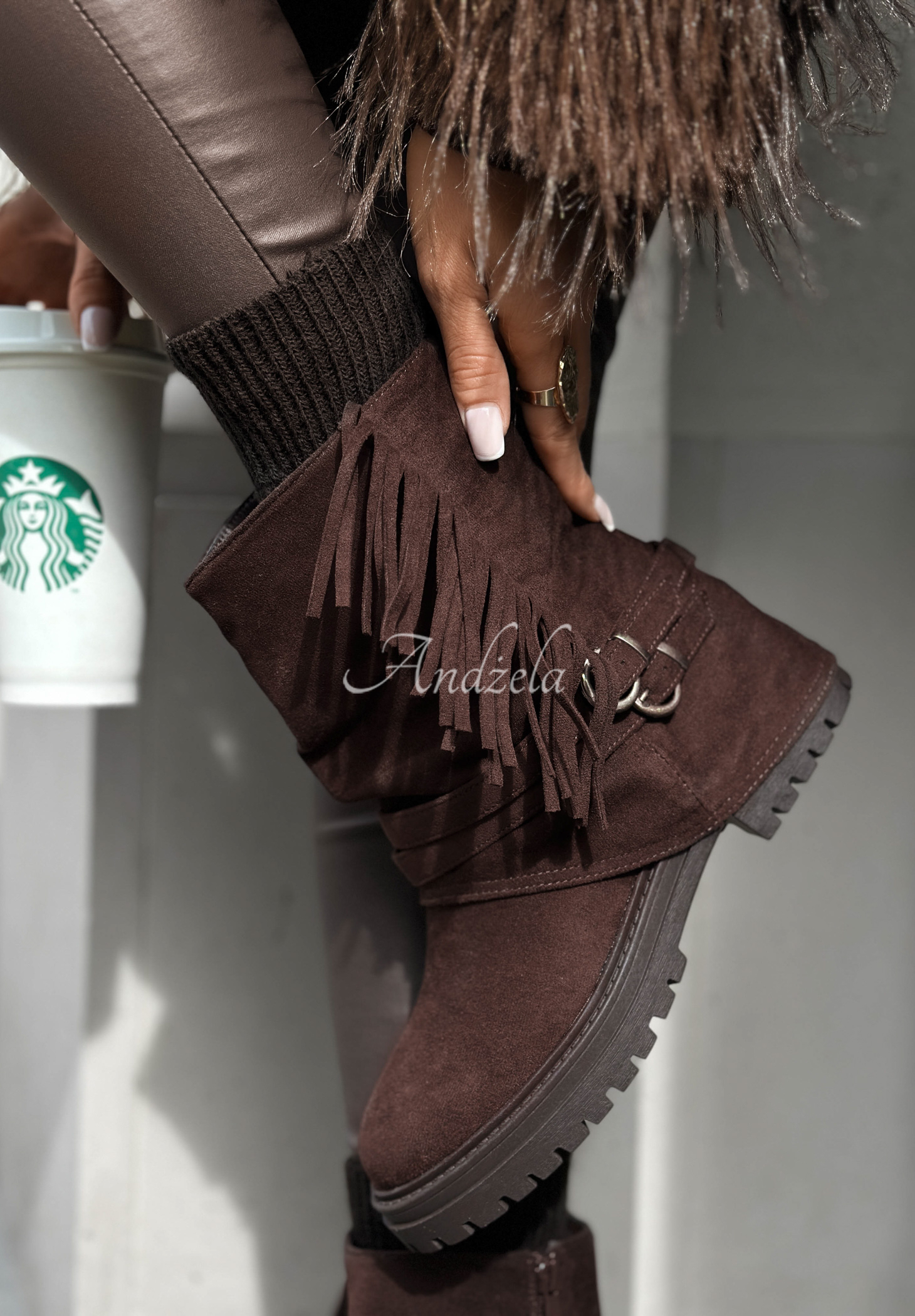 Botine din imitație de piele întoarsă, un model care se remarcă prin materialul suplimentar cu franjuri și catarame. Au carâmbul deasupra gleznei și vârful rotunjit. Se închid cu fermoar amplasat pe partea interioară.