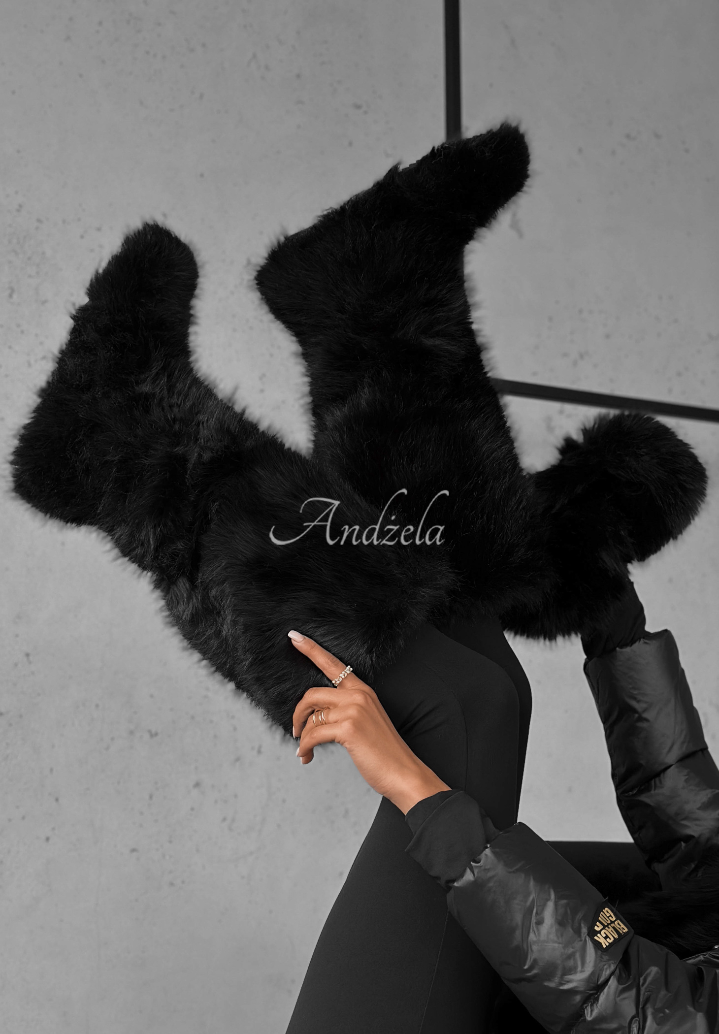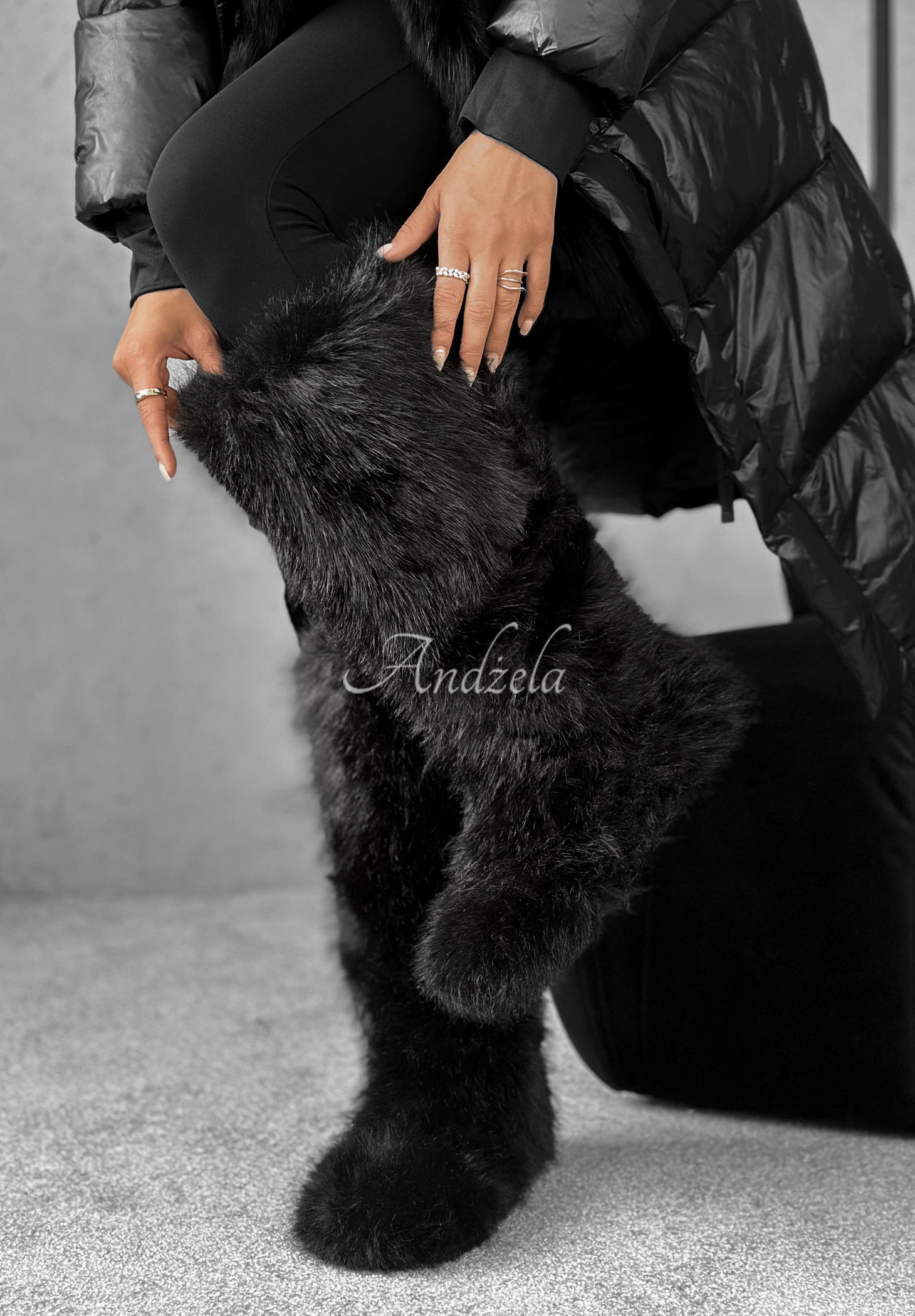 Cizme cu talpă joasă, acoperite în întregime cu un material tip blăniță moale la atingere. Acesta este un model fără închidere, cu vârf rotunjit, căptușit cu material tip de pluș.